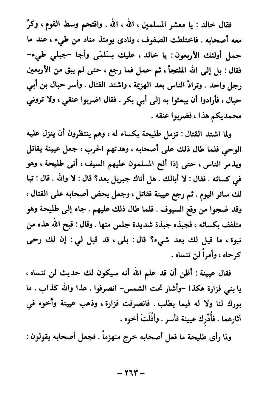 ولما اشتد القتال تزمل طليحة بكساء له، وهم ينتظرون أن ينزل عليه الوحي فلما طال ذلك على أصحابه وهدتهم الحرب جعل عيينة يقاتل ويذمر الناس حتى إذا ألح المسلمون عليهم السيف أتى طليحة وهو في كسائه. فقال: لا أبا لك، هل أتاك جبريل بعد؟ قال: لا والله. قال: تبا لك سائر اليوم. ثم رجع عيينة فقاتل، وجعل يحض أصحابه على القتال وقد ضجوا من وقع السيوف. فلما طال ذلك عليهم. جاء إلى طليحة وهو متلفف بكسائه فجبذه جبذة شديدة جلس منها. وقال: قبح الله هذه من نبوة، ما قيل لك بعد شيء؟ قال: بلى، قد قيل لي: إن لك رحى كرحاه وأمرا لن تنساه.