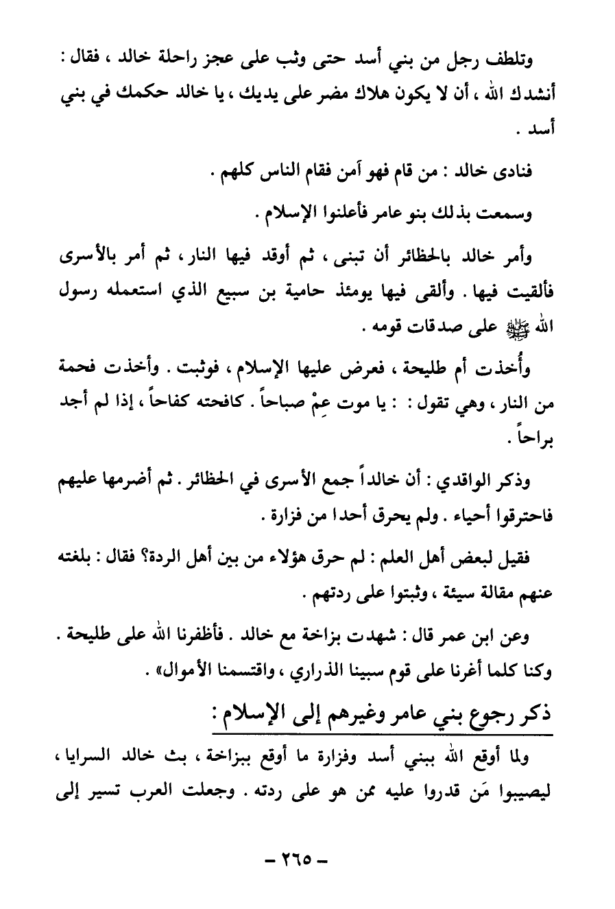 ذكر رجوع بني عامر وغيرهم إلى الإسلام ولما أوقع الله ببني أسد وفزارة ما أوقع ببزاخة بث خالد السرايا، ليصيبوا من قدروا عليه ممن هو على ردته. وجعلت العرب تسير إلى