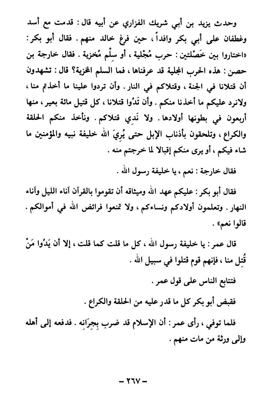 وحدث يزيد بن أبي شريك الفزاري عن أبيه قال: قدمت مع أسد وغطفان على أبي بكر وافدا، حين فرغ خالد منهم. فقال أبو بكر: " اختاروا بين خصلتين حرب مجلية أو سلم مخزية. فقال خارجة بن حصن: هذه الحرب المجلية قد عرفناها، فما السلم المخزية؟ قال: تشهدون أن قتلانا في الجنة وقتلاكم في النار. وأن تردوا علينا ما أخذتم منا، ولا نرد عليكم ما أخذنا منكم. وأن تدوا قتلانا، كل قتيل مائة بعير منها أربعون في بطونها أولادها. ولا ندي قتلاكم. ونأخذ منكم الحلقة والكراع وتلحقون بأذناب الإبل حتى يرى الله خليفة نبيه والمؤمنين ما شاء فيكم، أو يرى منكم إقبالا لما خرجتم منه.
