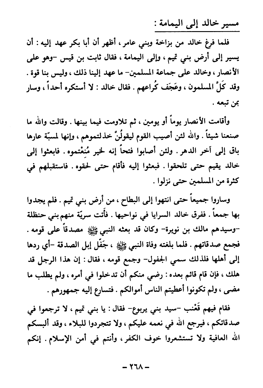 مسير خالد إلى اليمامة فلما فرغ خالد من بزاخة وبني عامر أظهر أن أبا بكر عهد إليه أن يسير إلى أرض بني تميم، وإلى اليمامة، فقال ثابت بن قيس - وهو على الأنصار، وخالد على جماعة المسلمين - ما عهد إلينا ذلك وليس بنا قوة. وقد كل المسلمون وعجف كراعهم. فقال خالد: لا أستكره أحدا، وسار بمن تبعه.