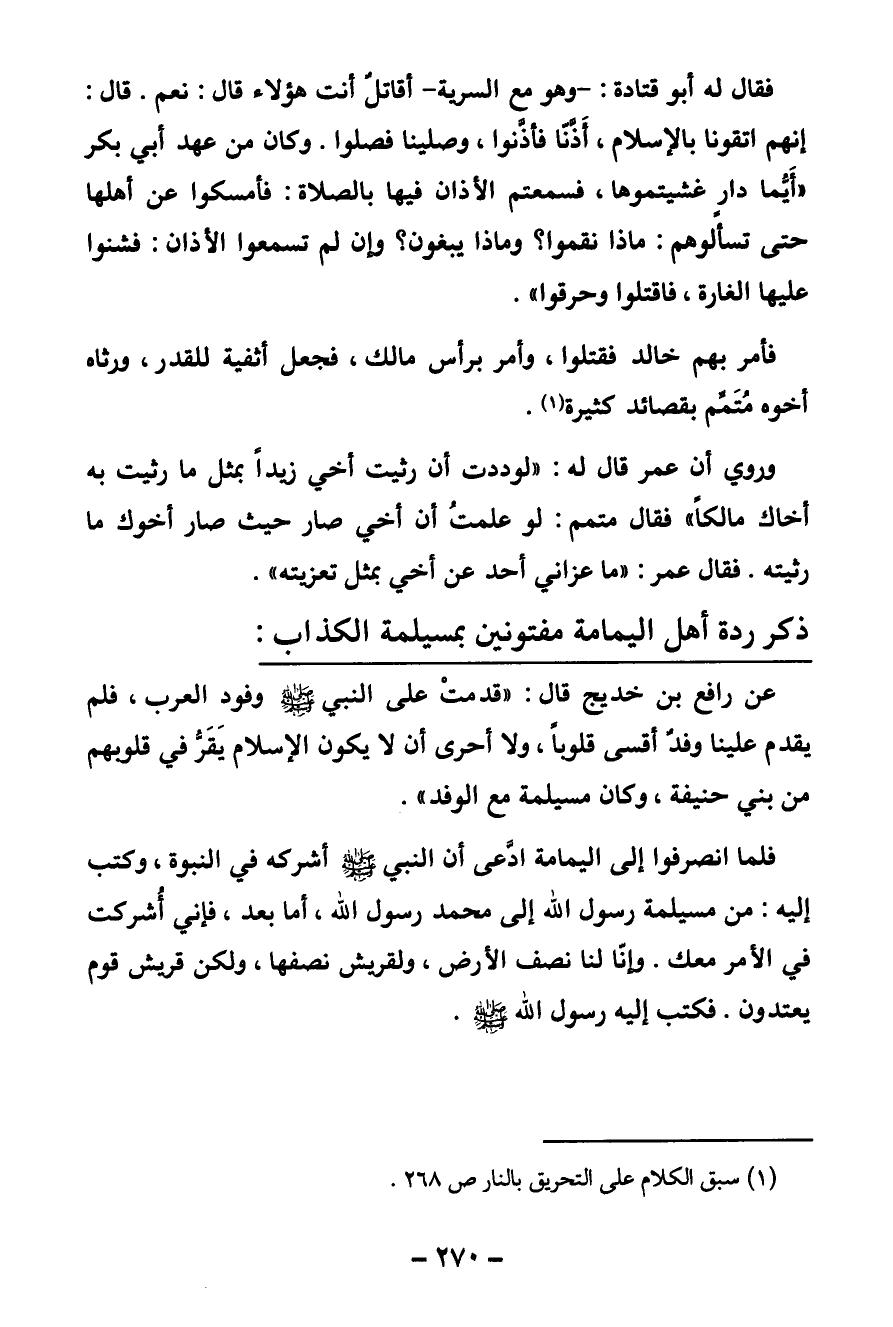 فقال له أبو قتادة: - وهو مع السرية - أقاتل أنت هؤلاء؟ قال: نعم. قال: إنهم اتقونا بالإسلام أذنا فأذنوا، وصلينا فصلوا. وكان من عهد أبي بكر " أيما دار غشيتموها فسمعتم الأذان فيها بالصلاة فأمسكوا عن أهلها حتى تسألوهم ماذا نقموا؟ وماذا يبغون؟ وإن لم تسمعوا الأذان فشنوا عليها الغارة فاقتلوا وحرقوا ". فأمر بهم خالد فقتلوا، وأمر برأس مالك فجعل أثفية للقدر ورثاه أخوه متمم بقصائد كثيرة (¬1) .