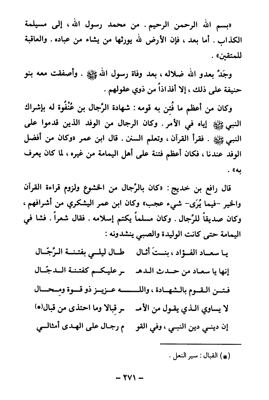 «بسم الله الرحمن الرحيم. من محمد رسول الله إلى مسيلمة الكذاب. أما بعد فإن الأرض لله يورثها من يشاء من عباده. والعاقبة للمتقين» .