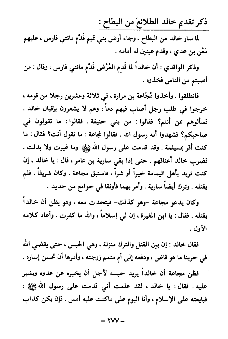 وكان يدعو مجاعة - وهو كذلك - فيتحدث معه وهو يظن أن خالدا يقتله. فقال يا ابن المغيرة إن لي إسلاما، والله ما كفرت. وأعاد كلامه الأول.