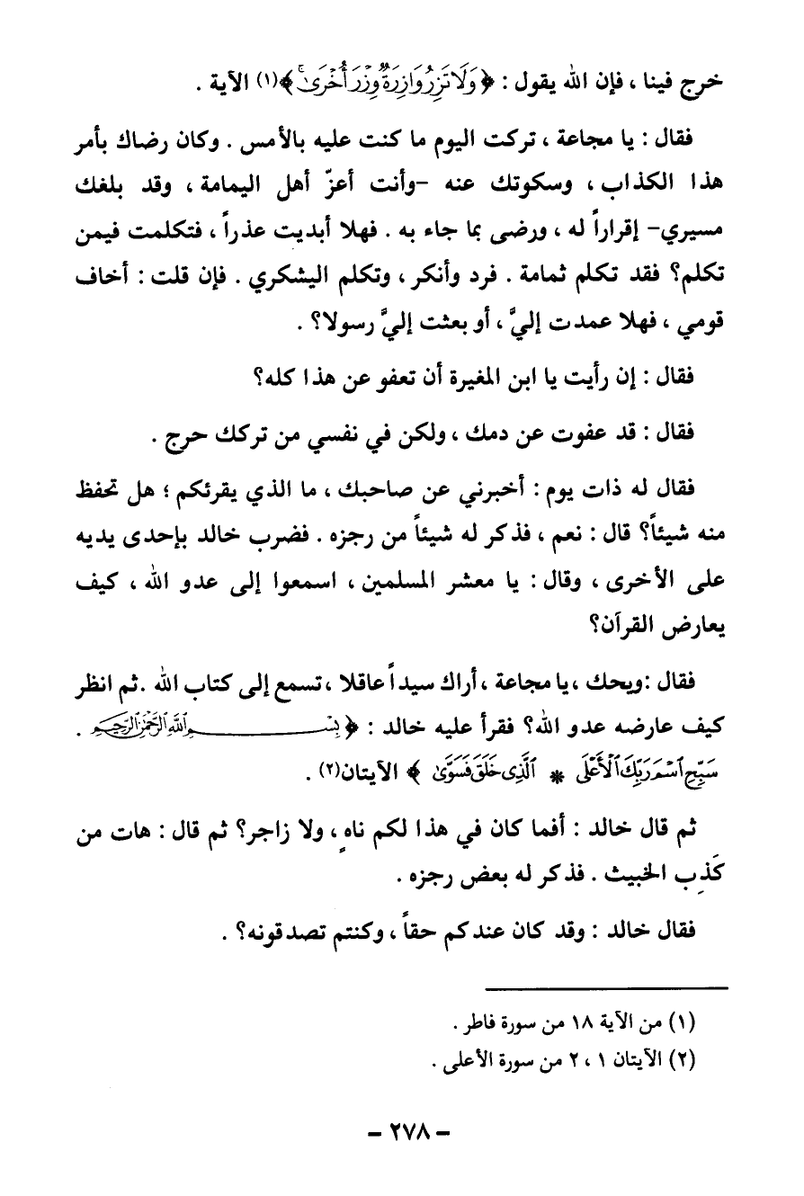 فقال: ويحك، يا مجاعة أراك سيدا عاقلا، تسمع إلى كتاب الله. ثم انظر كيف عارضه عدو الله؟ فقرأ عليه خالد: بسم الله الرحمن الرحيم {سَبِّحِ اسْمَ رَبِّكَ الْأَعْلَى - الَّذِي خَلَقَ فَسَوَّى} [الأعلى: 1 - 2] الآيتان (¬2) .