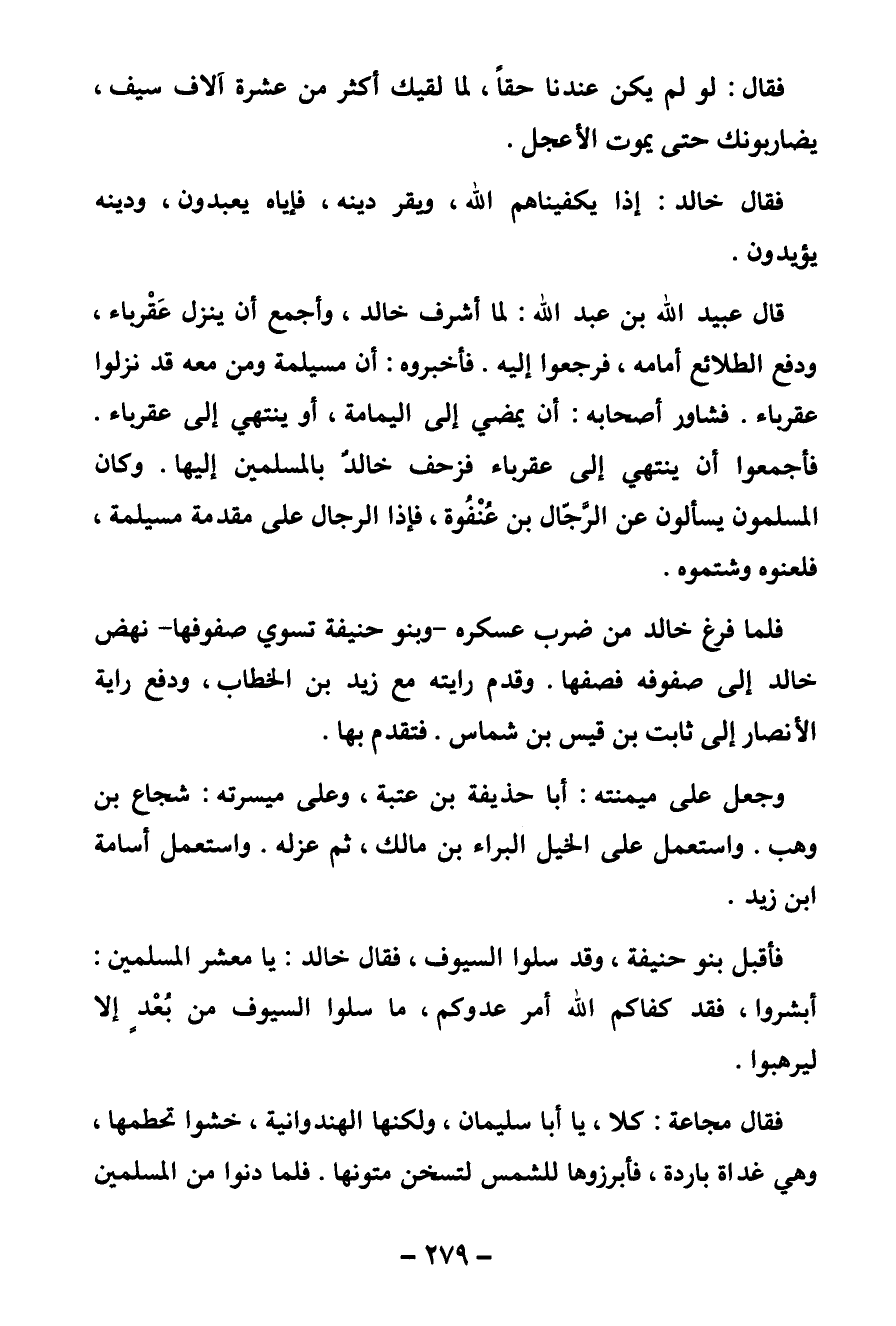 فأقبل بنو حنيفة، وقد سلوا السيوف. فقال خالد: " يا معشر المسلمين أبشروا فقد كفاكم الله أمر عدوكم " ما سلو السيوف من بعد إلا ليرهبوا.