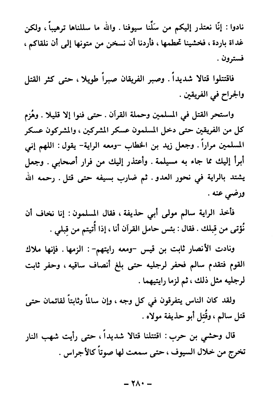 واستحر القتل في المسلمين وحملة القرآن حتى فنوا إلا قليلا. وهزم كل من الفريقين حتى دخل المسلمون عسكر المشركين والمشركون عسكر المسلمين مرارا. وجعل زيد بن الخطاب - ومعه الراية - يقول اللهم إني أبرأ إليك مما جاء به مسيلمة. وأعتذر إليك من فرار أصحابي. وجعل يشتد بالراية في نحور العدو. ثم ضارب بسيفه حثى قتل. رحمه الله ورضي عنه.