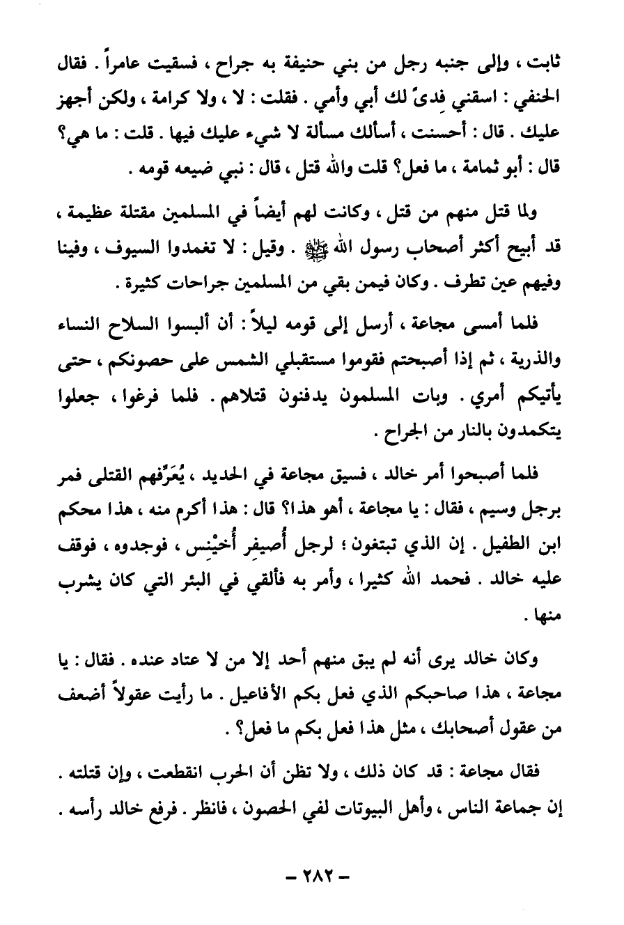 ثابت وإلى جنبه رجل من بني حنيفة به جراح فسقيت عامرا. فقال الحنفي: اسقني فدى لك أبي وأمي. فقلت: لا، ولا كرامة ولكن أجهز عليك. قال: أحسنت، أسألك مسألة لا شيء عليك فيها. قلت: ما هي؟ قال أبو ثمامة ما فعل؟ قلت، والله قتل، قال: نبي ضيعه قومه.