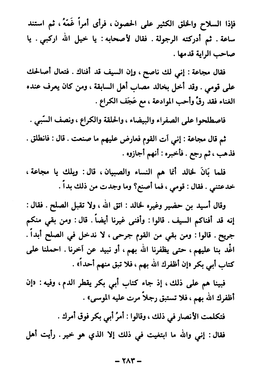 وقال أسيد بن حضير وغيره لخالد: اتق الله ولا تقبل الصلح. فقال إنه قد أفناكم السيف. قالوا: وأفنى غيرنا أيضا. قال: ومن بقي منكم جريح. قالوا: ومن بقي من القوم جرحى، لا ندخل في الصلح أبدا. اغد بنا عليهم حتى يظفرنا الله بهم أو نبيد عن آخرنا. احملنا على كتاب أبي بكر " إن أظفرك الله بهم فلا تبق منهم أحدا ".