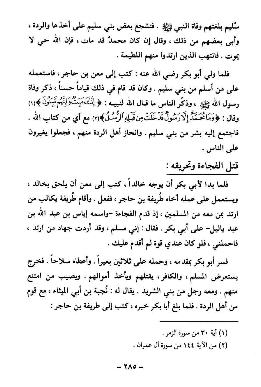 فلما ولي أبو بكر رضي الله عنه كتب إلى معن بن حاجر فاستعمله على من أسلم من بني سليم. وكان قد قام في ذلك قياما حسنا، ذكر وفاة رسول الله صلى الله عليه وسلم، وذكر الناس ما قال الله لنبيه: {إِنَّكَ مَيِّتٌ وَإِنَّهُمْ مَيِّتُونَ} [الزمر: 30] (¬1) وقال: {وَمَا مُحَمَّدٌ إِلَّا رَسُولٌ قَدْ خَلَتْ مِنْ قَبْلِهِ الرُّسُلُ} [آل عمران: 144] (¬2) مع آي من كتاب الله. فاجتمع إليه بشر من بني سليم. وانحاز أهل الردة منهم فجعلوا يغيرون على الناس.