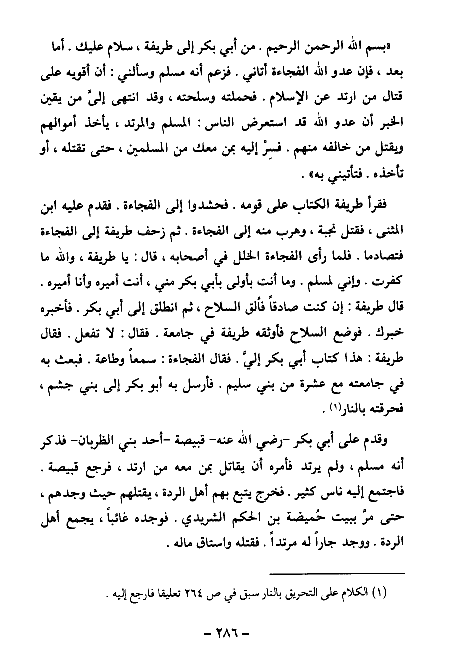 " بسم الله الرحمن الرحيم. من أبي بكر إلى طريفة، سلام عليك. أما بعد فإن عدو الله الفجاءة أتاني. فزعم أنه مسلم وسألني: أن أقويه على قتال من ارتد عن الإسلام. فحملته وسلحته وقد انتهى إلي من يقين الخبر أن عدو الله قد استعرض الناس المسلم والمرتد، يأخذ أموالهم ويقتل من خالفه منهم. فسر إليه بمن معك من المسلمين حتى تقتله أو تأخذه. فتأتيني به ".