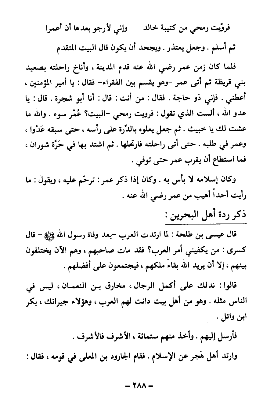 ذكر ردة أهل البحرين قال عيسى بن طلحة: لما ارتدت العرب - بعد وفاة رسول الله صلى الله عليه وسلم - قال كسرى: من يكفيني أمر العرب؟ فقد مات صاحبهم وهم الآن يختلفون بينهم إلا أن يريد الله بقاء ملكهم فيجتمعون على أفضلهم.