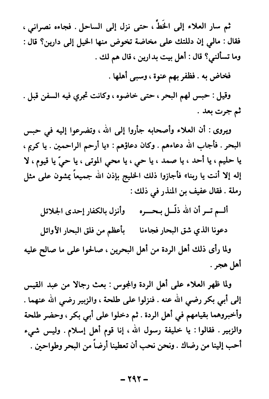 ويروى: أن العلاء وأصحابه جأروا إلى الله وتضرعوا إليه في حبس البحر فأجاب الله دعاءهم. وكان دعاؤهم " يا أرحم الراحمين. يا كريم يا حليم يا أحد يا صمد يا حي يا محيي الموتى، يا حي يا قيوم لا إله إلا أنت يا ربنا " فأجازوا ذلك الخليج بإذن الله جميعا يمشون على مثل رملة. فقال عفيف بن المنذر في ذلك: