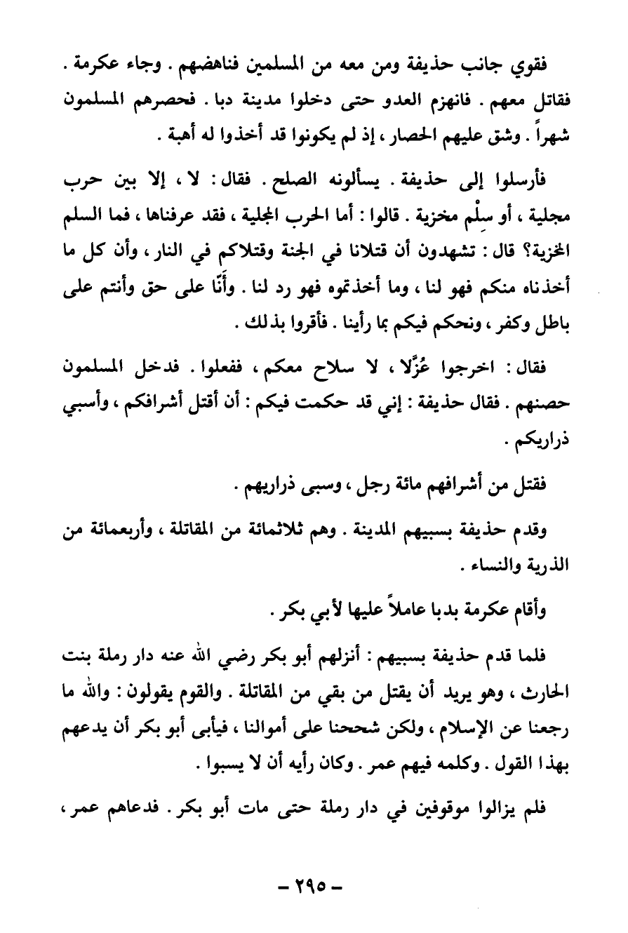 فلما قدم حذيفة بسبيهم أنزلهم أبو بكر رضي الله عنه دار رملة بنت الحارث، وهو يريد أن يقتل من بقي من المقاتلة. والقوم يقولون: والله ما رجعنا عن الإسلام ولكن شححنا على أموالنا، فيأبى أبو بكر أن يدعهم بهذا القول. وكلمه فيهم عمر. وكان الرأي أن لا يسبوا.