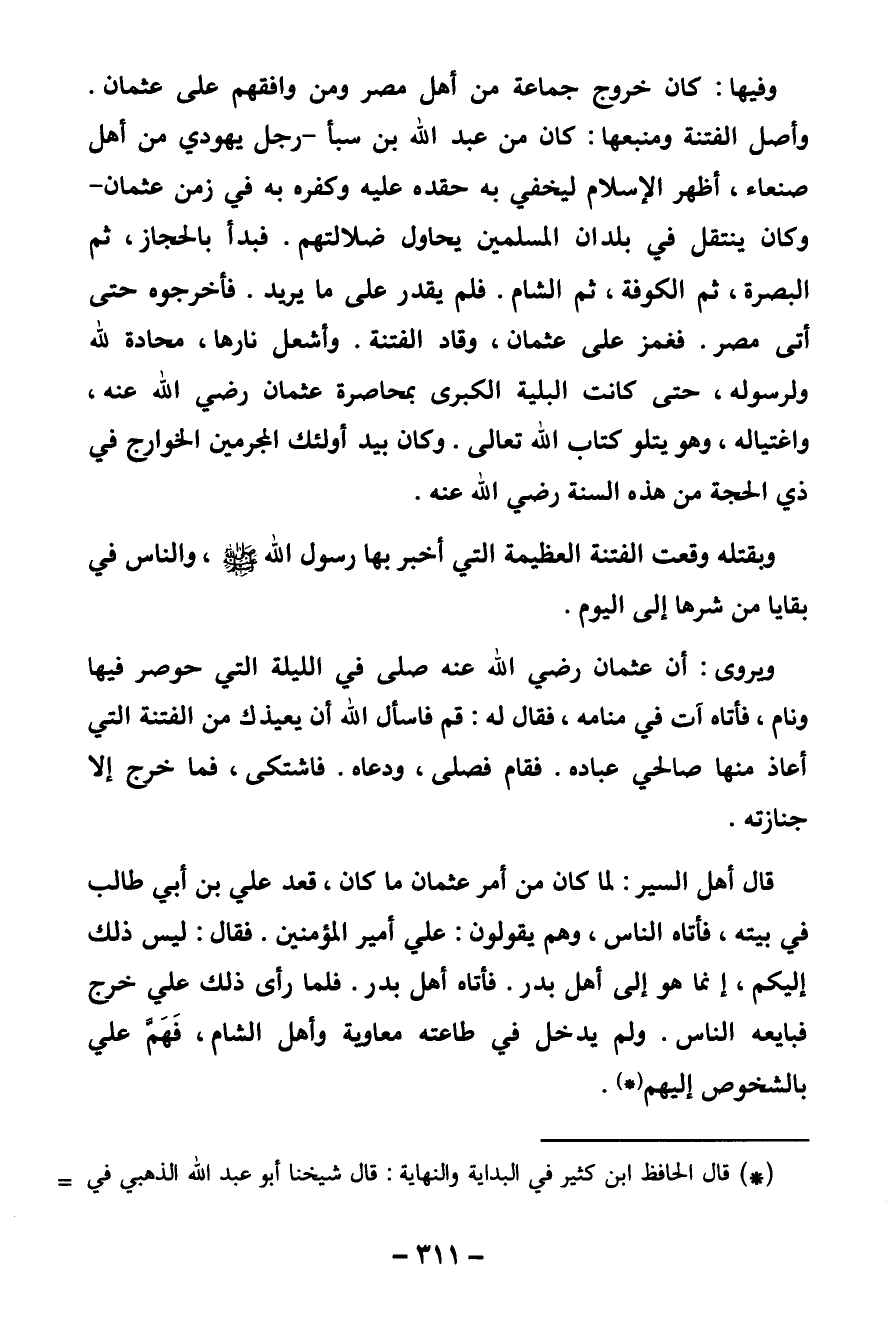 (¬1) قال الحافظ ابن كثير في البداية والنهاية: قال شيخنا أبو عبد الله الذهبي في آخر ترجمة عثمان رضي الله عنه وفضائله: " الذين قتلوه، أو ألبوا عليه: قتلوا إلى عفو الله ورحمته، والذين خذلوه: خذلوه وتنغص عيشهم، وكان الملك بعده في نائبة معاوية وبنيه، ثم في وزيره مروان وثمانية من ذريته، استطالوا حياته وملوه، مع فضله وسوابقه، فتملك عليهم من هو بني عمه بضعا وثمانين سنة، فالحكم لله العلي الكبير، هذا لفظ الذهبي بحروفه.