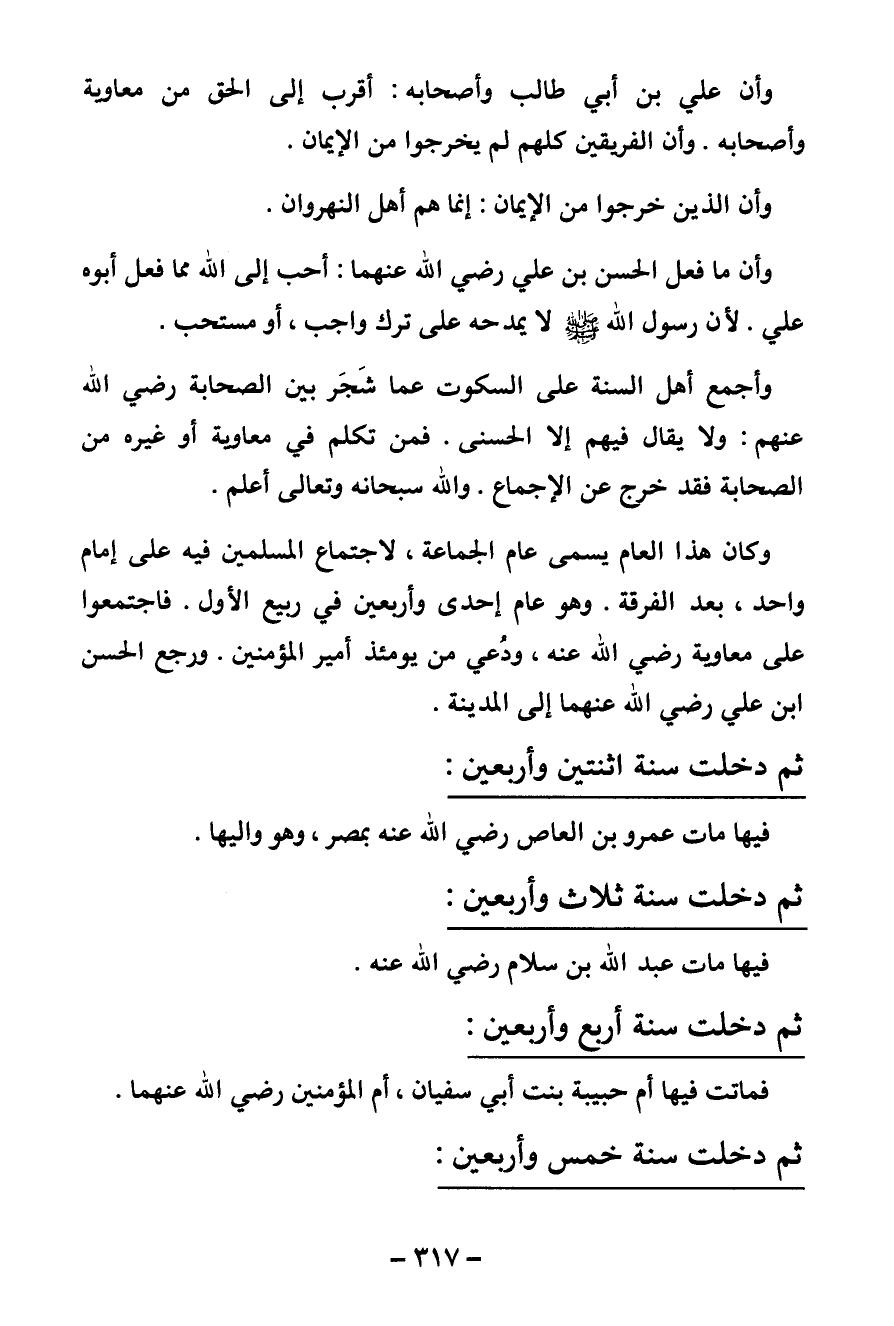 وكان هذا العام يسمى عام الجماعة لاجتماع المسلمين فيه على إمام واحد بعد الفرقة. وهو عام إحدى وأربعين في ربيع الأول. فاجتمعوا على معاوية رضي الله عنه ودعي من يومئذ أمير المؤمنين. ورجع الحسن بن علي رضي الله عنهما إلى المدينة.