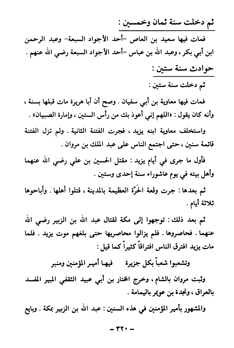 فمات فيها معاوية بن أبي سفيان. وصح أن أبا هريرة مات قبلها بسنة وأنه كان يقول: " اللهم إني أعوذ بك من رأس الستين، وإمارة الصبيان ".