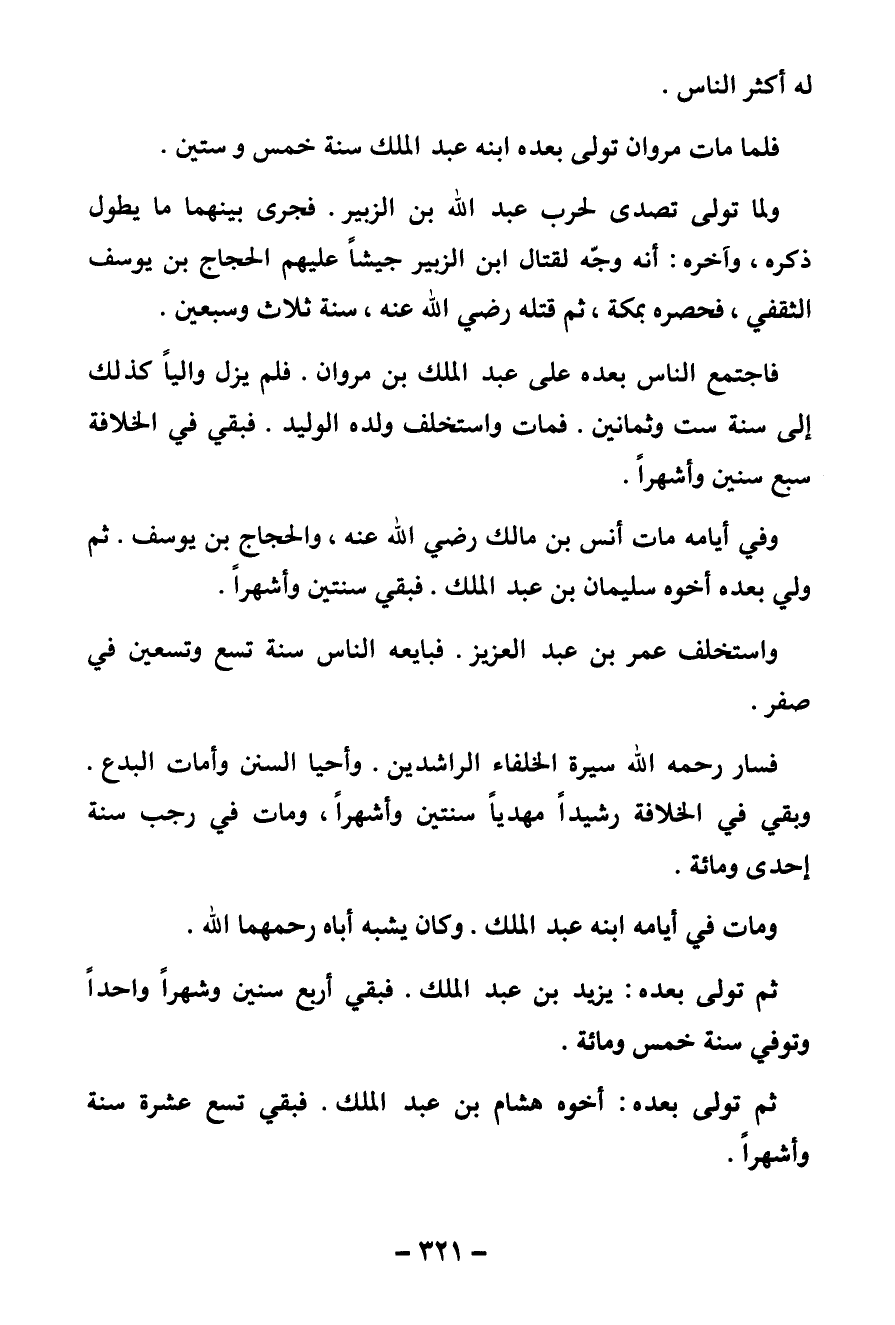 فاجتمع الناس بعده على عبد الملك بن مروان. فلم يزل واليا كذلك إلى سنة ست وثمانين. فمات واستخلف ولده الوليد. فبقي في الخلافة سبع سنين وأشهرا.