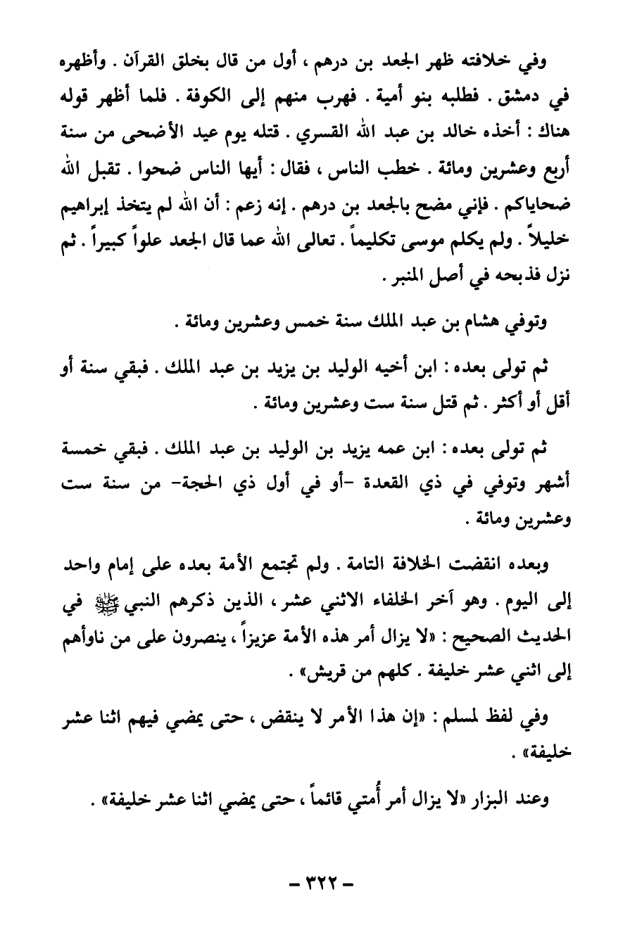 وبعده انقضت الخلافة التامة. ولم تجتمع الأمة بعده على إمام واحد إلى اليوم، وهو آخر الخلفاء الاثني عشر الذين ذكرهم النبي صلى الله عليه وسلم في الحديث الصحيح: «لا يزال أمر هذه الأمة عزيزا ينصرون على من ناوأهم إلى اثني عشر خليفة كلهم من قريش» .