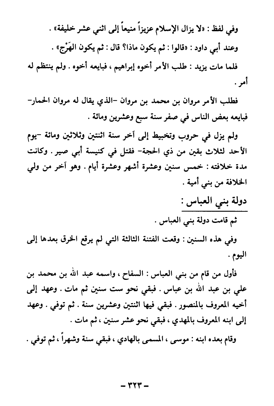 فأول من قام من بني العباس السفاح واسمه عبد الله بن محمد بن علي بن عبد الله بن عباس فبقي نحو ست سنين ثم مات. وعهد إلى أخيه المعروف بالمنصور. فبقي فيها اثنتين وعشرين سنة ثم توفي. وعهد إلى ابنه المعروف بالمهدي فبقي نحو عشر سنين ثم مات.