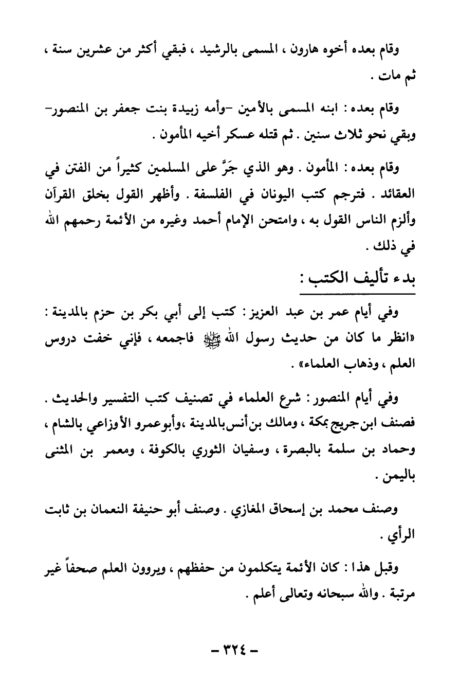 بدء تأليف الكتب في أيام عمر بن عبد العزيز: كتب إلى أبي بكر بن حزم بالمدينة: " انظر ما كان من حديث رسول الله صلى الله عليه وسلم فاجمعه، فإني خفت دروس العلم، وذهاب العلماء ".