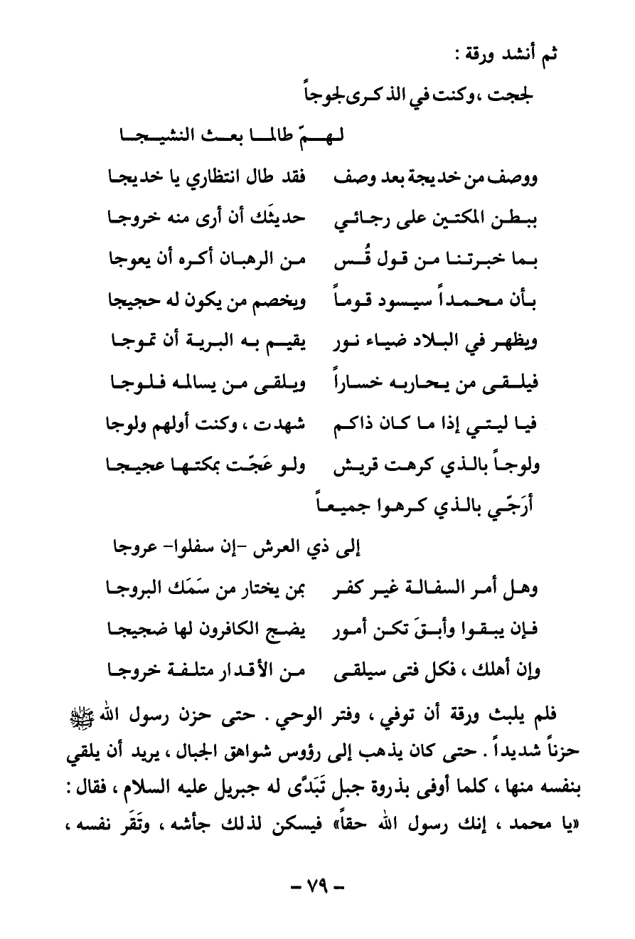 فلم يلبث ورقة أن توفي، وفتر الوحي. حتى حزن رسول الله صلى الله عليه وسلم حزنا شديدا. حتى كان يذهب إلى رءوس شواهق الجبال، يريد أن يلقي بنفسه منها، كلما أوفى بذروة جبل تَبَدَّى له جبريل عليه السلام، فقال: يا محمد، إنك رسول الله حقا " فيسكن لذلك جأشه، وتَقَر نفسه،