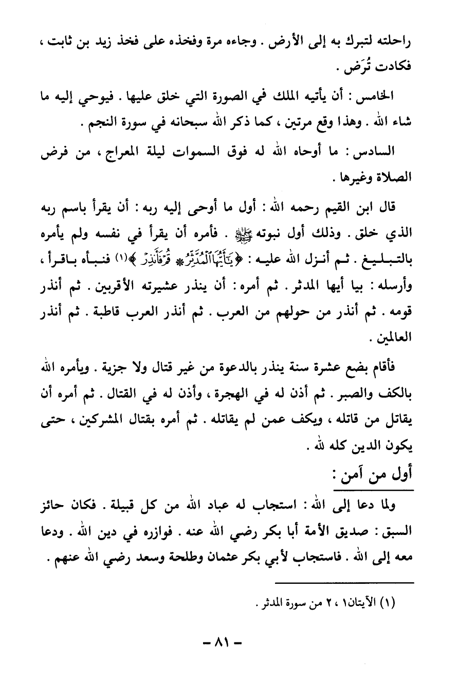 قال ابن القيم رحمه الله: أول ما أوحى إليه ربه: أن يقرأ باسم ربه الذي خلق. وذلك أول نبوته صلى الله عليه وسلم. فأمره أن يقرأ في نفسه ولم يأمره بالتبليغ. ثم أنزل الله عليه: {يَا أَيُّهَا الْمُدَّثِّرُ - قُمْ فَأَنْذِرْ} [المدثر: 1 - 2] (¬1) فنبأه باقرأ، وأرسله ب: {يَا أَيُّهَا الْمُدَّثِّرُ} [المدثر: 1] ثم أمره: أن ينذر عشيرته الأقربين. ثم أنذر قومه. ثم أنذر من حولهم من العرب. ثم أنذر العرب قاطبة. ثم أنذر العالمين.