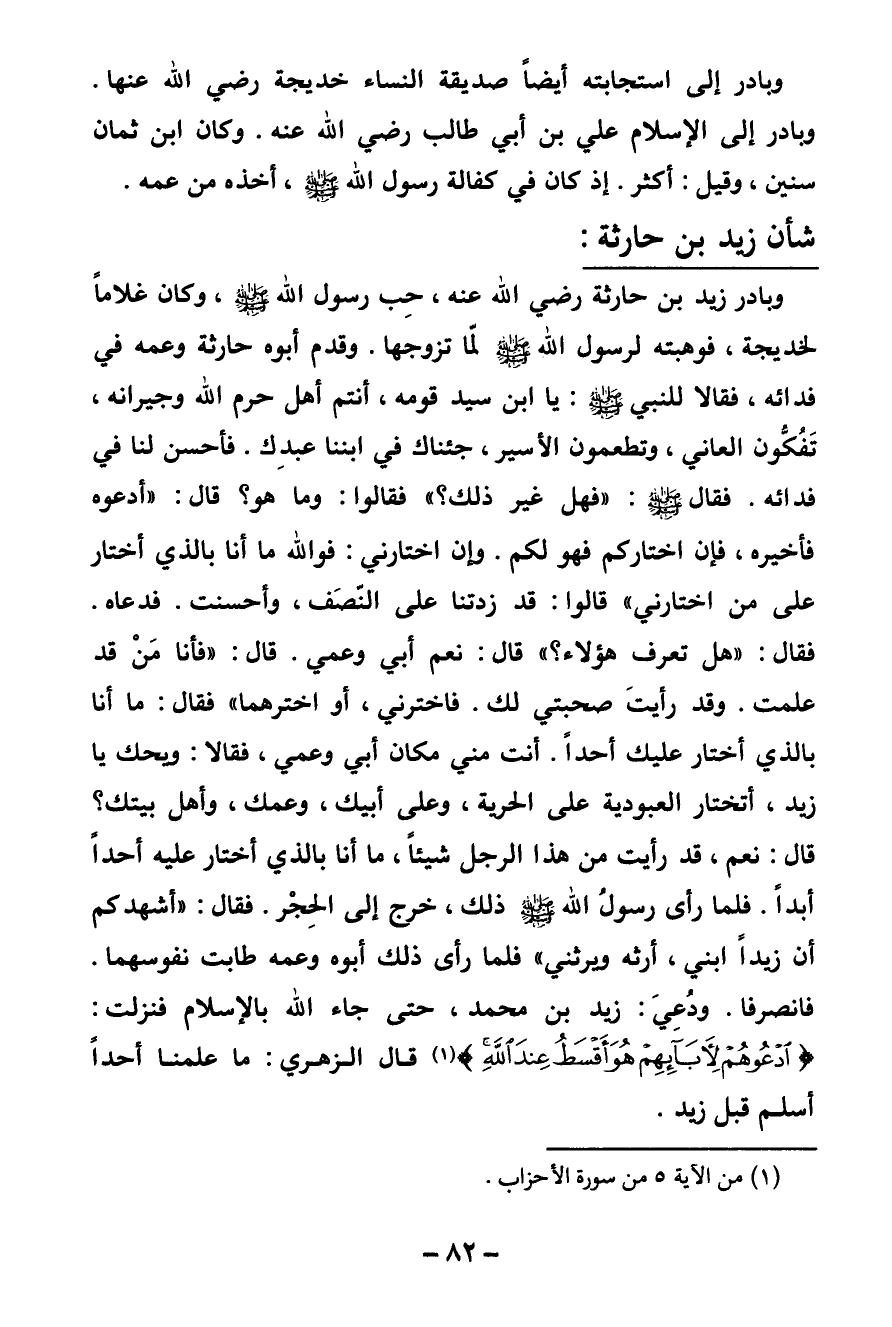 شأن زيد بن حارثة وبادر زيد بن حارثة رضي الله عنه، حِب رسول الله صلى الله عليه وسلم، وكان غلاما لخديجة، فوهبته لرسول الله صلى الله عليه وسلم لمّا تزوجها. «وقدم أبوه حارثة وعمه في فدائه، فقالا للنبي صلى الله عليه وسلم: يا ابن سيد قومه، أنتم أهل حرم الله وجيرانه، تَفُكُّون العاني، وتطعمون الأسير، جئناك في ابننا عبدِك. فأحسن لنا في فدائه. فقال صلى الله عليه وسلم: فهل غير ذلك؟ فقالوا: وما هو؟ قال: أدعوه فأخيره، فإن اختاركم فهو لكم. وإن اختارني: فوالله ما أنا بالذي أختار على من اختارني" قالوا: قد زدتنا على النّصَف، وأحسنت. فدعاه. فقال: هل تعرف هؤلاء؟ قال: نعم أبي وعمي. قال: فأنا من قد علمت. وقد رأيت صحبتي لك. فاخترني، أو اخترهما. فقال: ما أنا بالذي أختار عليك أحدا. أنت مني مكان أبي وعمي. فقالا: ويحك يا زيد أتختار العبودية على الحرية. وعلى أبيك وعمك، وأهل بيتك؟ قال: نعم، قد رأيت من هذا الرجل شيئا، ما أنا بالذي أختار عليه أحدا أبدا. فلما رأى رسول الله صلى الله عليه وسلم ذلك خرج إلى الحِجْر. فقال: أشهدكم أن زيدا ابني، أرثه ويرثني فلما رأى ذلك أبوه وعمه طابت نفوسهما. فانصرفا. ودُعِيَ: زيد بن محمد، حتى جاء الله بالإسلام فنزلت: {ادْعُوهُمْ لِآبَائِهِمْ هُوَ أَقْسَطُ عِنْدَ اللَّهِ} [الأحزاب: 5] (¬1) » قال الزهري: ما علمنا أحدا أسلم قبل زيد.