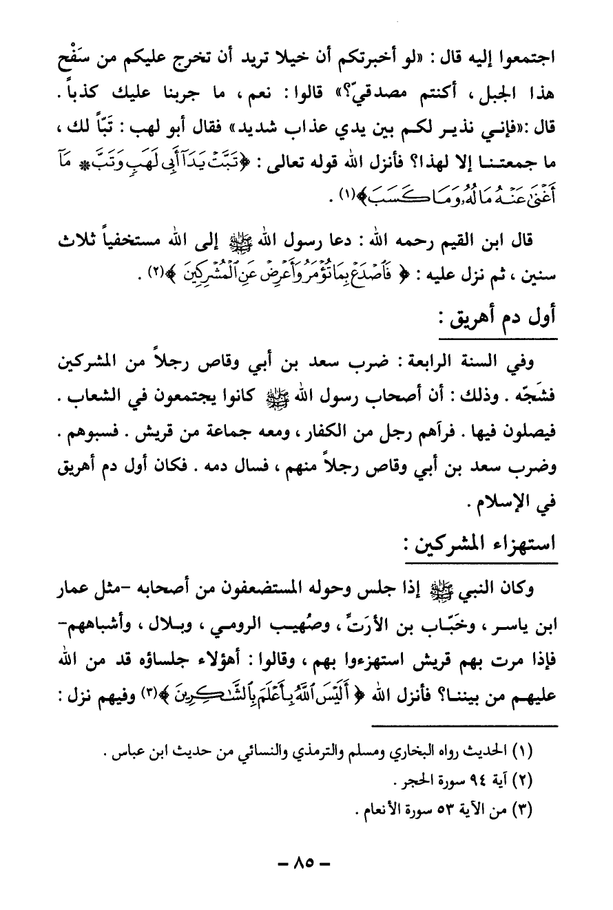 قال ابن القيم رحمه الله: دعا رسول الله صلى الله عليه وسلم إلى الله مستخفيًا ثلاث سنين، ثم نزل عليه: {فَاصْدَعْ بِمَا تُؤْمَرُ وَأَعْرِضْ عَنِ الْمُشْرِكِينَ} [الحجر: 94] (¬2) .