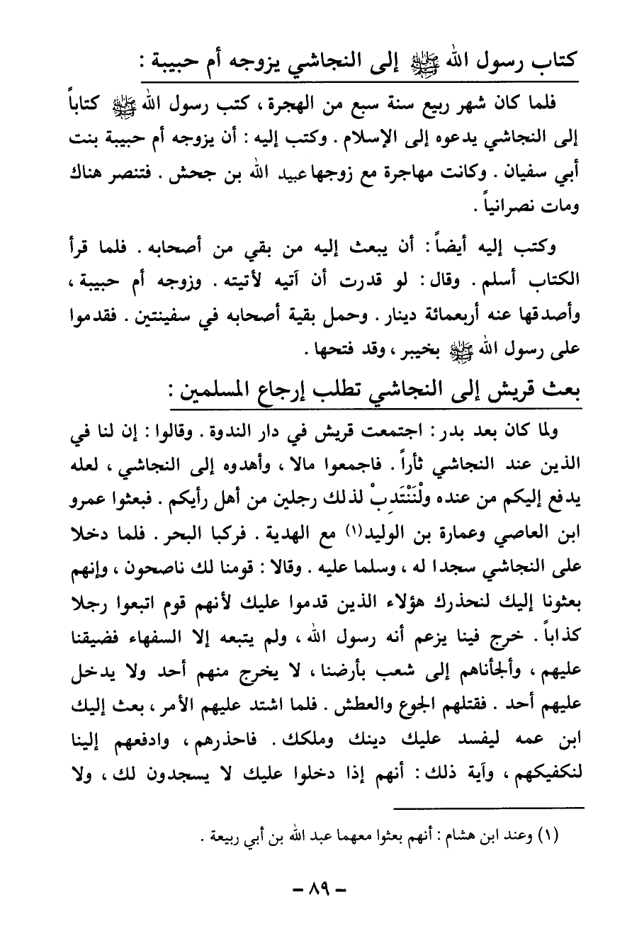 كتاب رسول الله صلى الله عليه وسلم إلى النجاشي يزوجه أم حبيبة فلما كان شهر ربيع سنة سبع من الهجرة. كتب رسول الله صلى الله عليه وسلم كتابا إلى النجاشي يدعوه إلى الإسلام. وكتب إليه: أن يزوجه أم حبيبة بنت أبي سفيان. وكانت مهاجرة مع زوجها عبد الله بن جحش. فتنصر هناك ومات نصرانيا.