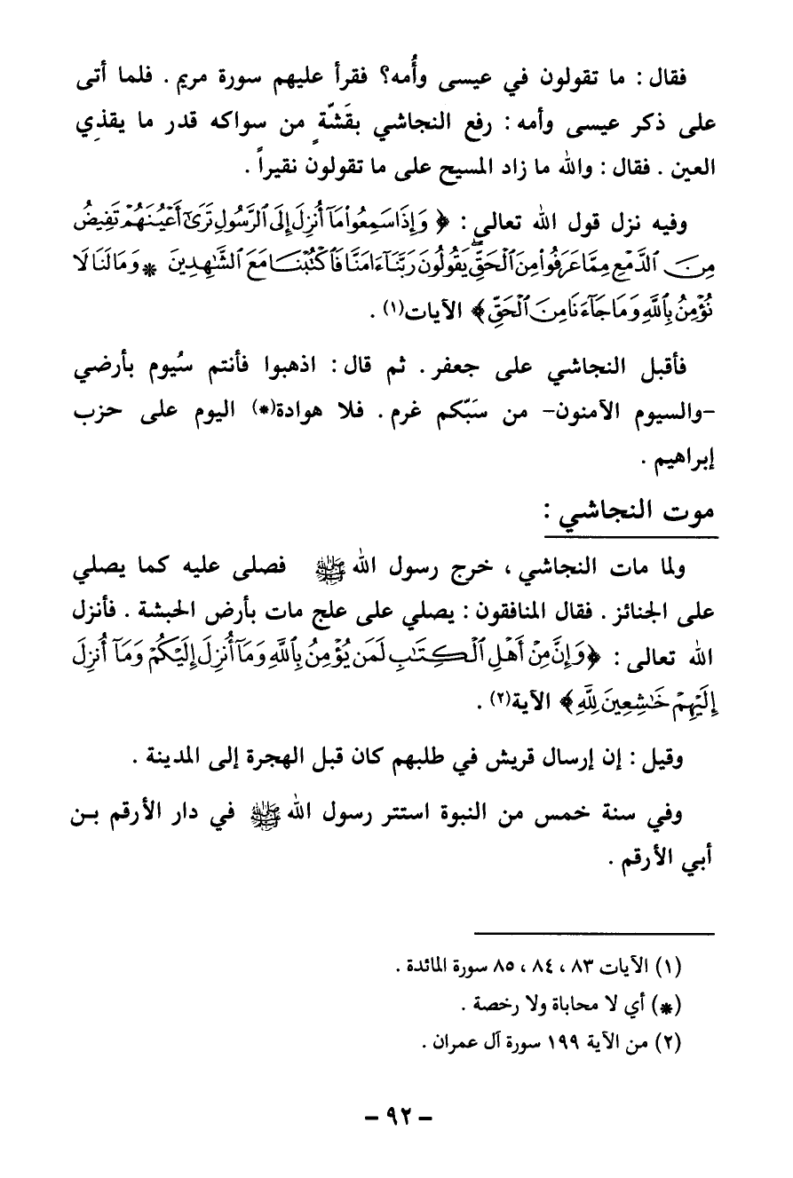موت النجاشي «ولما مات النجاشي، خرج رسول الله صلى الله عليه وسلم فصلى عليه كما يصلي على الجنائز. فقال المنافقون: يصلي على علج مات بأرض الحبشة. فأنزل الله تعالى: {وَإِنَّ مِنْ أَهْلِ الْكِتَابِ لَمَنْ يُؤْمِنُ بِاللَّهِ وَمَا أُنْزِلَ إِلَيْكُمْ وَمَا أُنْزِلَ إِلَيْهِمْ خَاشِعِينَ لِلَّهِ} [آل عمران: 199] الآية» (¬3) .