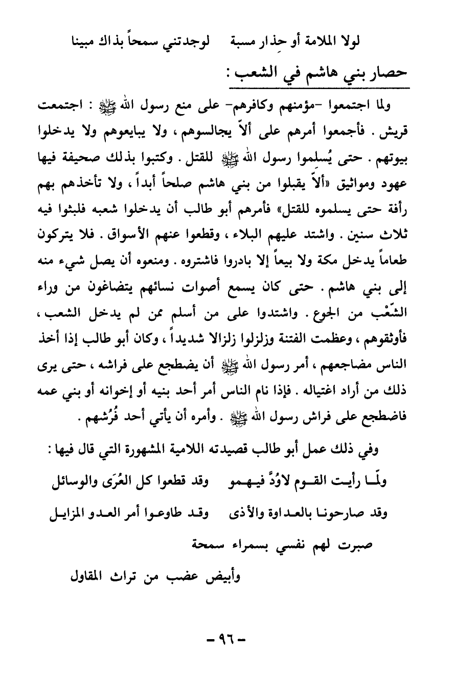 حصار بني هاشم في الشعب ولما اجتمعوا - مؤمنهم وكافرهم - على منع رسول الله صلى الله عليه وسلم: اجتمعت قريش. فأجمعوا أمرهم على ألّا يجالسوهم، ولا يبايعوهم ولا يدخلوا بيوتهم. حتى يُسلِموا رسول الله صلى الله عليه وسلم للقتل. وكتبوا بذلك صحيفة فيها عهود ومواثيق " ألّا يقبلوا من بني هاشم صلحًا أبدًا، ولا تأخذهم بهم رأفة حتى يسلموه للقتل " فأمرهم أبو طالب أن يدخلوا شعبه فلبثوا فيه ثلاث سنين. واشتد عليهم البلاء وقطعوا عنهم الأسواق. فلا يتركون طعامًا يدخل مكة، ولا بيعًا إلا بادروا فاشتروه. ومنعوه أن يصل شيء منه إلى بني هاشم. حتى كان يسمع أصوات نسائهم يتضاغون من وراء الشِّعْب من الجوع. واشتدوا على من أسلم ممن لم يدخل الشعب، فأوثقهم. وعظمت الفتنة وزلزلوا زلزالا شديدًا، وكان أبو طالب إذا أخذ الناس مضاجعهم. أمر رسول الله صلى الله عليه وسلم أن يضطجع على فراشه حتى يرى ذلك من أراد اغتياله.