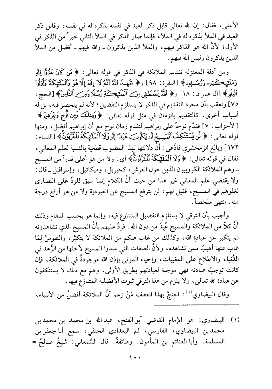 ومن أدلة المعتزلة تقديم الملائكة في الذكر في قوله تعالى: {مَنْ كَانَ عَدُوّاً لِلَّهِ وَمَلائِكَتِهِ وَرُسُلِهِ} [البقرة:98] و {شَهِدَ اللَّهُ أَنَّهُ لا إِلَهَ إِلَّا هُوَ وَالْمَلائِكَةُ وَأُولُو الْعِلْمِ} [آل عمران: 18] و {اللَّهُ يَصْطَفِي مِنَ الْمَلائِكَةِ رُسُلًا وَمِنَ النَّاسِ} [الحج:57] وتعقب بأن مجرد التقديم في الذكرلا يستلزم التفضيل؛ لأنه لم ينحصر فيه، بل له أسباب أخرى، كالتقديم بالزمان في مثل قوله تعالى: {وَمِنْكَ وَمِنْ نُوحٍ وَإِبْرَاهِيمَ} [الأحزاب: 7] فقدم نوحاً على إبراهيم لتقدم زمان نوحٍ مع أن إبراهيم أفضل، ومنها قوله تعالى: {لَنْ يَسْتَنْكِفَ الْمَسِيحُ أَنْ يَكُونَ عَبْداً لِلَّهِ وَلا الْمَلائِكَةُ الْمُقَرَّبُونَ} [النساء:172] وبالغ الزمخشري فادَّعى: أن دلالتها لهذا المطلوب قطيعة بالنسبة لعلم المعاني، فقال في قوله تعالى: {وَلاالْمَلائِكَةُ الْمُقَرَّبُونَ} أي: ولا من هو أعلى قدرًا من المسيح -وهم الملائكة الكروبيون الذين حوْل العرش، كجبريل، وميكائيل، وإسرافيل- قال: ولا يقتضي علم المعاني غير هذا من حديث أن الكلام إنما سِيق للرد على النصارى لغلوهم في المسيح، فقيل لهم: لن يترفع المسيح عن العبودية ولا من هو أرفع درجة منه. انتهى ملخصاً.