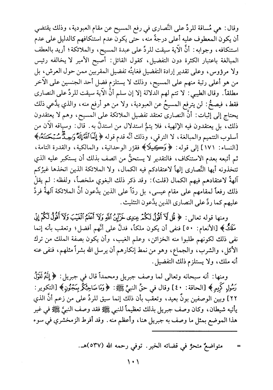 وقال: هي مُساقة للردعلى النصارى في رفع المسيح عن مقام العبودية، وذلك يقتضي أن يكون المعطوف عليه أعلى درجة منه، حتى يكون عدم استنكافهم كالدليل على عدم استنكافه، وجوابه: أن الآية سيقت للردعلى عبدة المسيح، والملائكة؛ أُريد بالعطف المبالغة باعتبار الكثرة دون التفضيل، كقول القائل: أصبح الأميرلا يخالفه رئيس ولا مرؤوس، وعلى تقدير إرادة التفضيل، كقول القائل: أصبح الأمير لا يخالفه رئيس ولا مرؤوس، وعلى تقدير إرادة التفضيل فغايته تفضيل المقربين ممن حول العرش، بل من هو أعلى رتبةً منهم على المسيح، وذلك لا يستلزم فضل أحد الجنسين على الآخر مطلقاً. وقال الطيبي: لا تتم لهم الدلالة إلا إنْ ُسلم أنَّ الآية سيقت للرد على النصاري فقط، فيصحُّ: لن يترفع المسيح عن العبودية، ولا من هو أرفع منه، والذي يدعي ذلك يحتاج إلى إثبات: أن النصارى تعتقد تفضيل الملائكة على المسيح، وهم لا يعتقدون ذلك، بل يعتقدون فيه الإلهية، فلا يتمُّ استدلال من استدَّل به. قال: وسياقه الآن من أسلوب التتميم والمبالغة، لا الترقي، وذلك أنه قدم قوله {إِنَّمَا اللَّهُ إِلَهٌ وَاحِدٌ سُبْحَانَهُ} [النساء:171] إلى قوله: {وَكِيلًا} فقرر الوحدانية، والمالكية، والقدرة التامة، ثم أتبعه بعدم الاستنكاف، فالتقدير لا يستحق من اتَّصف بذلك أن يستكبر عليه الذي تتخذونه أيها النصارى إلهًا لاعتقادكم فيه الكمال، ولا الملائكة الذي اتَّخذها غيركم آلهة لاعتقادهم فيهم الكمال "قلت": وقد ذكر ذلك البغوي ملخصاً، ولفظه: لم يقل ذلك رفعًا لمقامهم على مقام عيسى، بل ردًا على الذين يدعون أن الملائكة آلهة فرد عليهم كما رد على النصارى الذين يدعون التثليث.