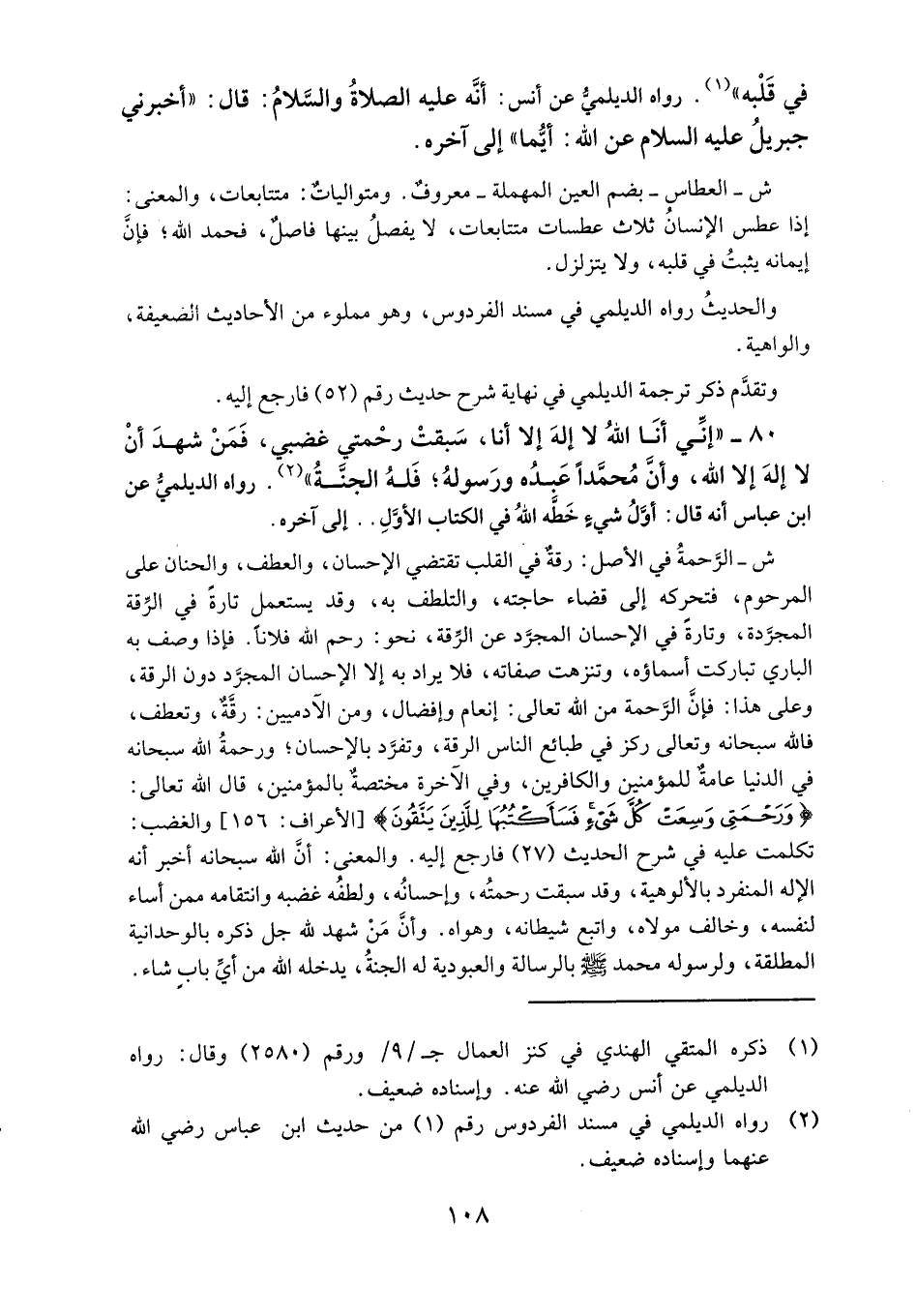 ش - الرحمة في الأصل: رقة في القلب تقتضي الإحسان، والعطف، والحنان على المرحوم، فتحركه إلى قضاء حاجته، والتلطف به، وقد يستعمل تارة في الرِّقة المجردة، وتارة في الإحسان المجرد عن الرقة، نحو: رحم الله فلانًا. فإذا وصف به الباري تباركت أسماؤه، وتنزهت صفاته، فلا يراد به إلا الإحسان المجرد دون الرقة، وعلى هذا: فإن الرحمة من الله تعالى: إنعام وإفضال، ومن الآدميين: رقة، وتعطف، فالله سبحانه وتعالى ركز في طبائع الناس الرقة، وتفرد بالإحسان؛ ورحمة الله سبحانة في الدنيا عامة للمؤمنين والكافرين، وفي الآخرة مختصة بالمؤمنين، قال الله تعالى: {وَرَحْمَتِي وَسِعَتْ كُلَّ شَيْءٍ فَسَأَكْتُبُهَا لِلَّذِينَ يَتَّقُونَ} [ألأعراف:156] والغضب: تكلمت عليه في شرح الحديث "27"فارجع إليه. والمعنى: أن الله سبحانه أخبر أنه الإله المنفرد بالألوهية، وقد سبقت رحمته، وإحاسنه، ولطفه غضبه وانتقامه ممن أساء لنفسه، وخالف مولاه، واتبع شيطانه، وهواه. وأن من شهد لله جلَّ ذكره بالوحدانية المطلقة، ولرسوله محمد صلى الله عليه وسلم بالرسالة والعبودية له الجنة، يدخله الله من أي باب شاء.