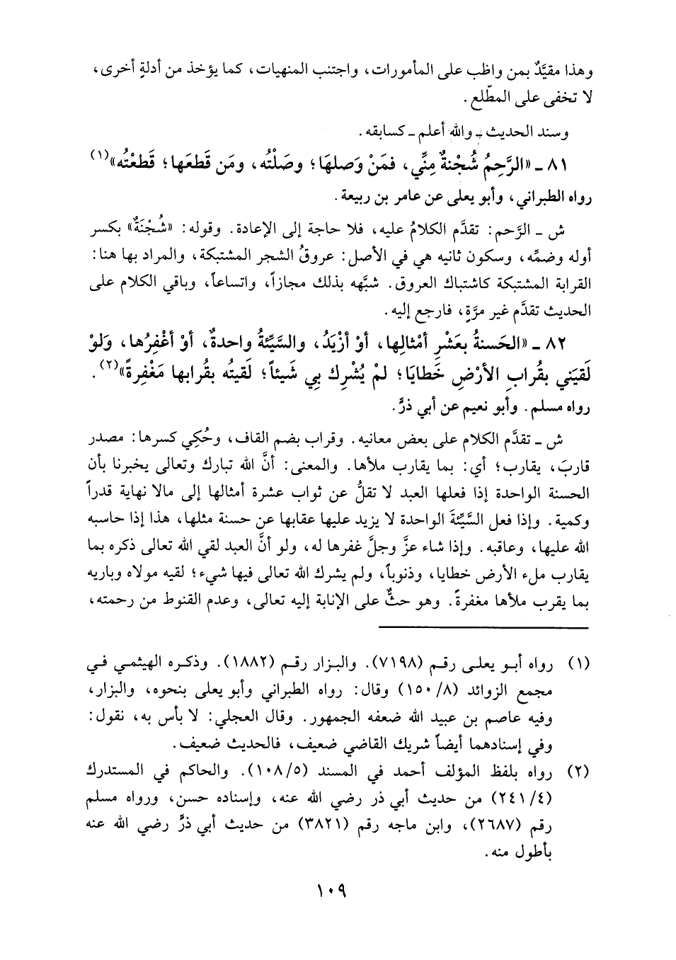 81- "الرَّحِم شُجنة مني، فمن وصلها؛ وصلته، ومن قطعها؛ قطعته" 1 رواه الطبراني، وأبو يعلى عن عامر بن ربيعة.
