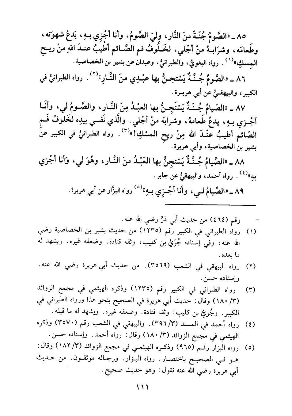 86- "الصوم جنة يَسْتجنُّ بها عبدي من النار"1. رواه الطبراني في الكبير، والبيهقي عن أبي هريرة.