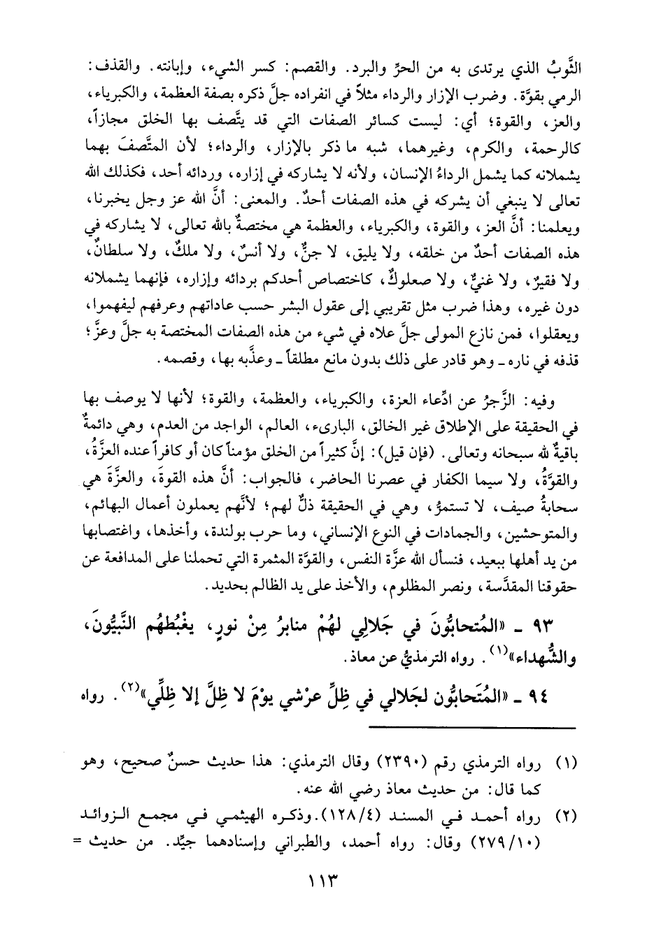 93- "المُتحابُّون في جلالي لهم منابر من نور، يغبُطهم النبيون، والشهداء" 1. رواه الترمذي عن معاذ.
