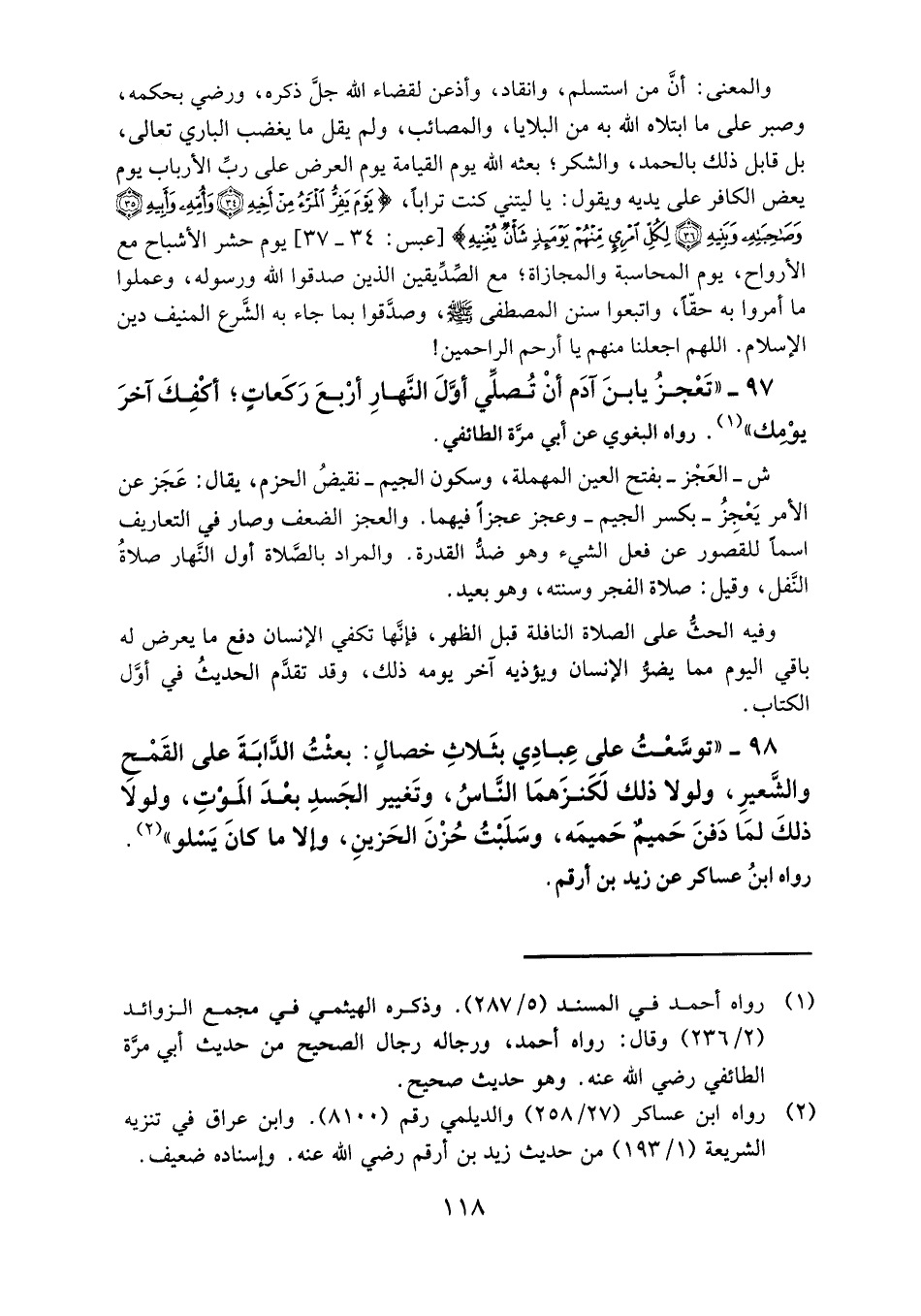 97- "تعجز يابن آدم أن تصلي أول النهار أربع ركعاتٍ؛ أكفك آخر يومك" 1. رواه البغوي عن أبي مرة الطائفي.