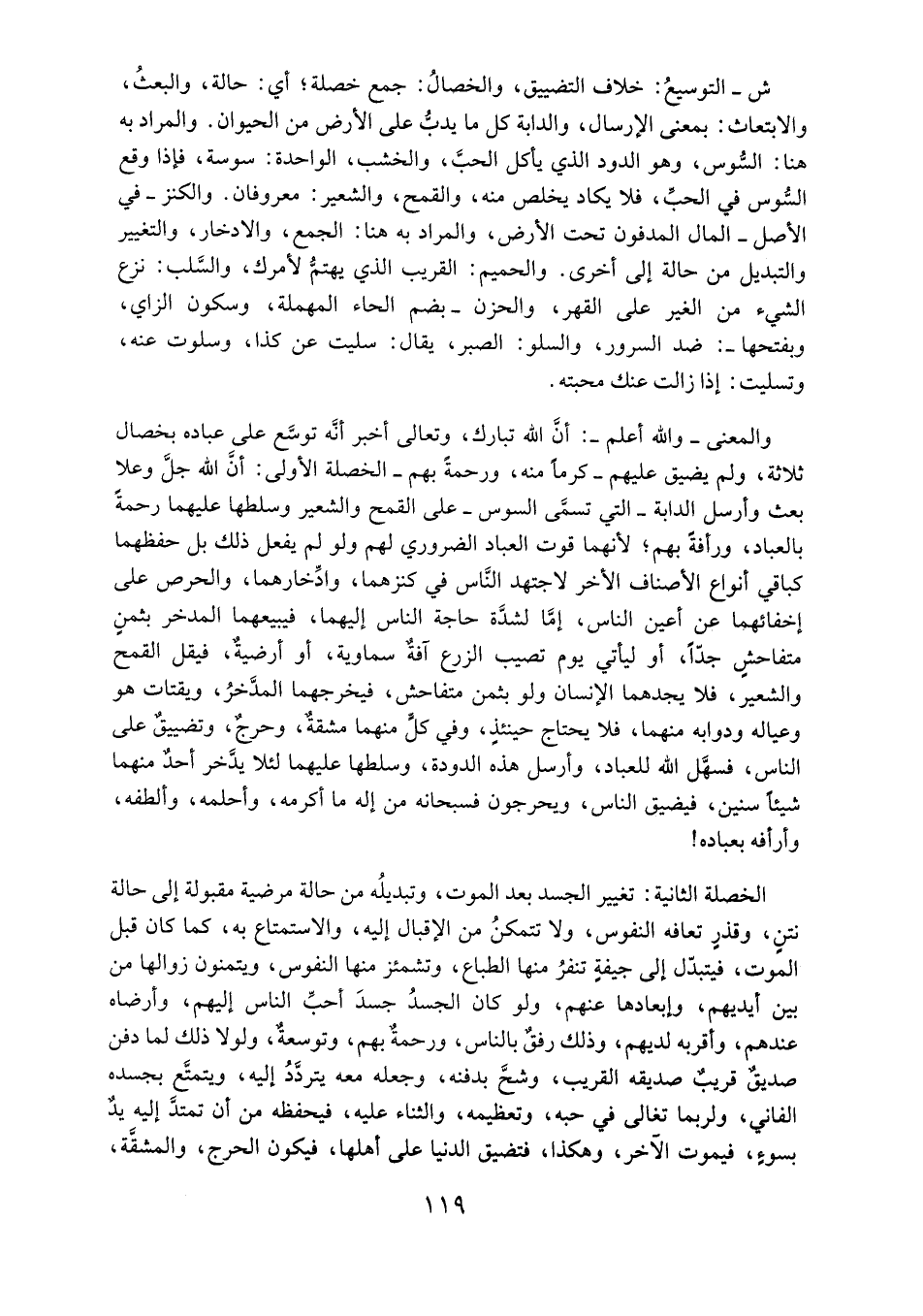 ش- التوسيع: خلاف التضييق، والخصال: جمع خصلة؛ أي: حالة، والبعث، والابتعاث: بمعنى الإرسال، والدابة كل ما يدب على الأرض من الحيوان. والمراد به هنا: السوس، وهو الدود الذي يأكل الحب، والخشب، الواحدة: سوسة، فإذا وقع السوس في الحب، فلا يكاد يخلص منه، والقمح، والشعير: معروفان. والكَنز -في الأصل- المال المدفون تحت الأرض، والمراد به هنا: الجمع، والادخار، والتغيير والتبديل في حالة إلى أخرى. والحميم: القريب الذي يهتم لأمرك، والسلب: نزع الشيء من الغير على القهر، والحزن -بضم الحاء المهملة، وسكون الزاي، وبفتحها-: ضد السرور، والسلو: الصبر، يقال: سليت عن كذا، وسلوت عنه، وتسليت: إذا زالت عنك محبته.