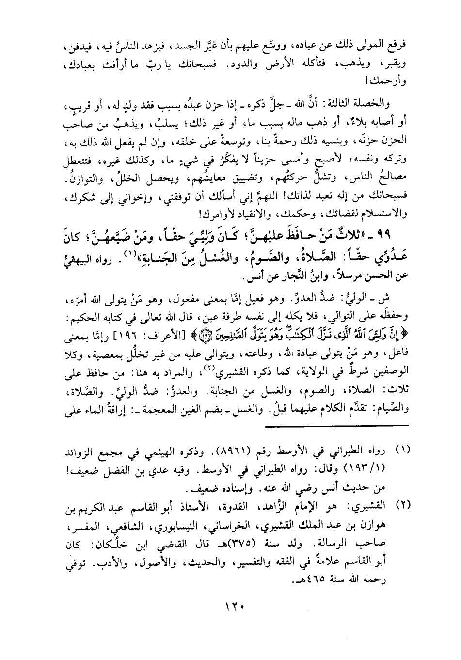 2 القشيري: هو الإمام الزاهد، القدوة، الأستاذ أبو القاسم عبد الكريم بن هوازن بن عبد الملك القشيري، الخراساني، النيسابوري، الشافعي، المفسر، صاحب الرسالة. ولد سة 375هـ قال القاضي ابن خلكان: كان أبو القاسم علاة في الفقه والتفسير، والحديث، والأصول، والأدب: توفي رحمه الله سنة 465هـ.
