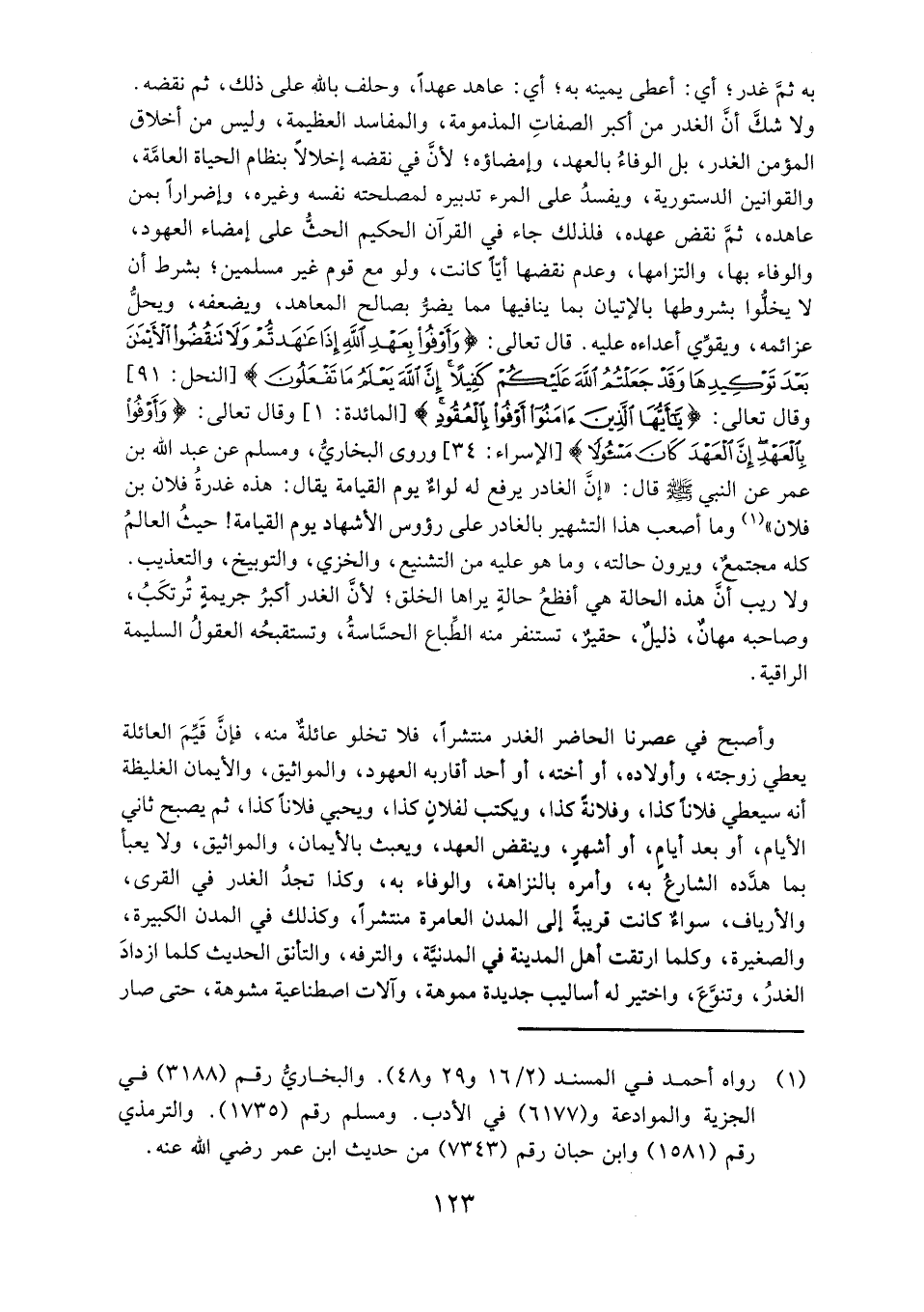 به ثم غدر؛ أي: أعطى يمينه به؛ أي: عاهد عهدًا، وحلف بالله على ذلك، ثم نقضه. ولا شك أن الغدر من أكبر الصفات المذمومة، والمفاسد العظيمة، وليس من أخلاق المؤمن الغدر، بل الوفاء بالعهد، وإمضاؤه؛ لأن في نقضه إخلالًا بنظام الحياة العامة، والقوانين الدستورية، ويفسد على المرء تدبيره لمصلحته نفسه، وغيره، وإضرارًا بمن عاهده، ثم نقض عهده، فلذلك جاء في القرآن الحكيم الحث على إمضاء العهود، والوفاء بها، والتزامها، وعدم نقضها أيا كانت، ولو مع قوم غير مسلمين؛ بشرط أن لا يُخلُّوا بشروطها بالإتيان بما ينافيها مما يضر بصالح المعاهد، ويضعفه، ويحل عزائمه، ويقوى أعداءه عليه. قال تعالى: {وَأَوْفُوا بِعَهْدِ اللَّهِ إِذَا عَاهَدْتُمْ وَلا تَنْقُضُوا الْأَيْمَانَ بَعْدَ تَوْكِيدِهَا وَقَدْ جَعَلْتُمُ اللَّهَ عَلَيْكُمْ كَفِيلاً إِنَّ اللَّهَ يَعْلَمُ مَا تَفْعَلُونَ} [النحل:91] وقال تعالى: {يَا أَيُّهَا الَّذِينَ آمَنُوا أَوْفُوا بِالْعُقُودِ}