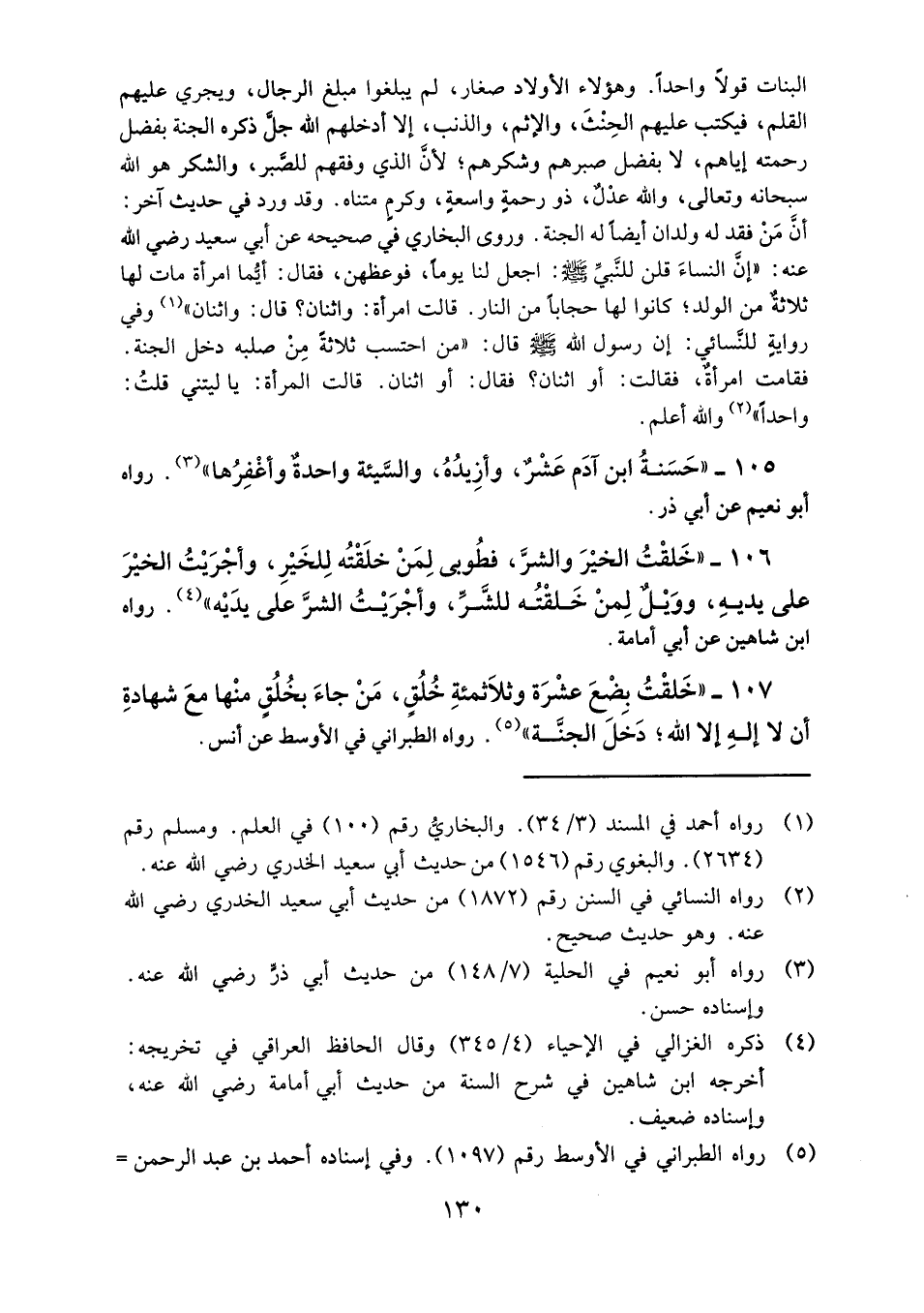 البنات قولًا واحدًا. وهؤلاء الأولاد صغار، لم يبلغوا مبلغ الرجال، ويجري عليهم القلم، فيكتب عليهم الحنث، والإثم، والذنب، إلا أدخلهم الله جل ذكره الجنة؛بفضل رحمته إياهم، لا بفضل صبرهم وشكرهم؛ لأن الذي وفقهم للصبر، والشكر هو الله سبحانه وتعالى، والله عدل، ذو رحمة واسعة، وكرم متناه. وقد ورد في حديث آخر: أن من فقد له ولدان أيضًا له الجنة. وروي البخاري في صحيحه عن أبي سعيد رضي الله عنه: "إن النساء قلن للنبي صلى الله عليه وسلم: اجعل لنا يوماً، فوعظهن، فقال: أيُّما امرأة مات لها ثلاثة من الولد؛ كانوا لها حجابًا من النار. قالت امرأة: واثنان؟ قال: واثنان" 1 وفي رواية للنسائي: إن رسول الله صلى الله عليه وسلم قال: "من احتسب ثلاثة من صلبه دخل الجنة. فقامت امرأة، فقالت: أواثنان؟ فقال: أواثنان. قالت المرأة: يا ليتني قلت: واحدًا" 2 والله أعلم.