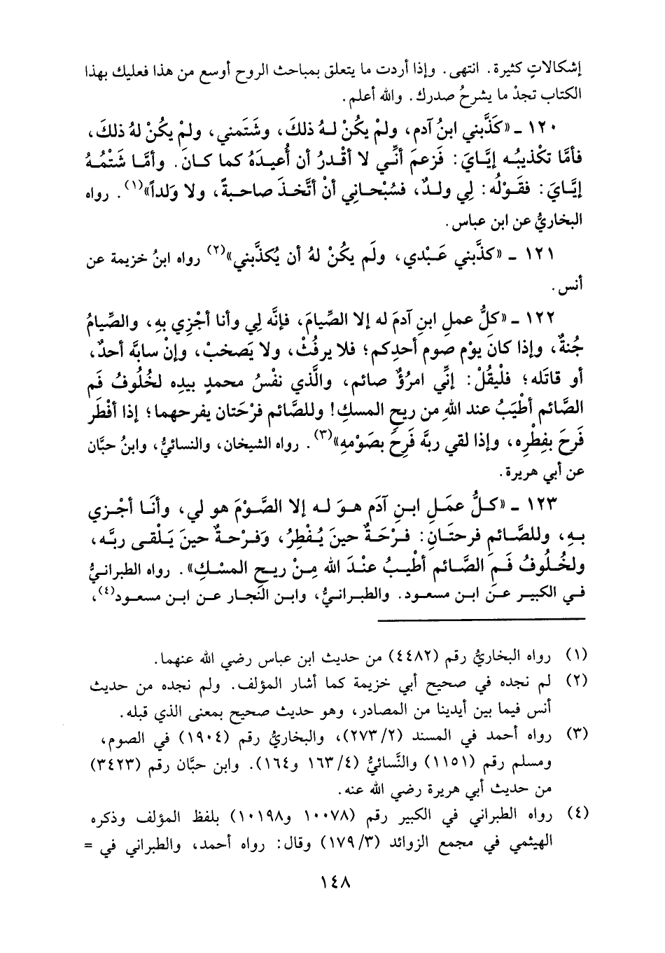 121- "كذبني عبدي، ولم يكن له أن يكذبني" 1 رواه ابن خزيمة عن أنس.