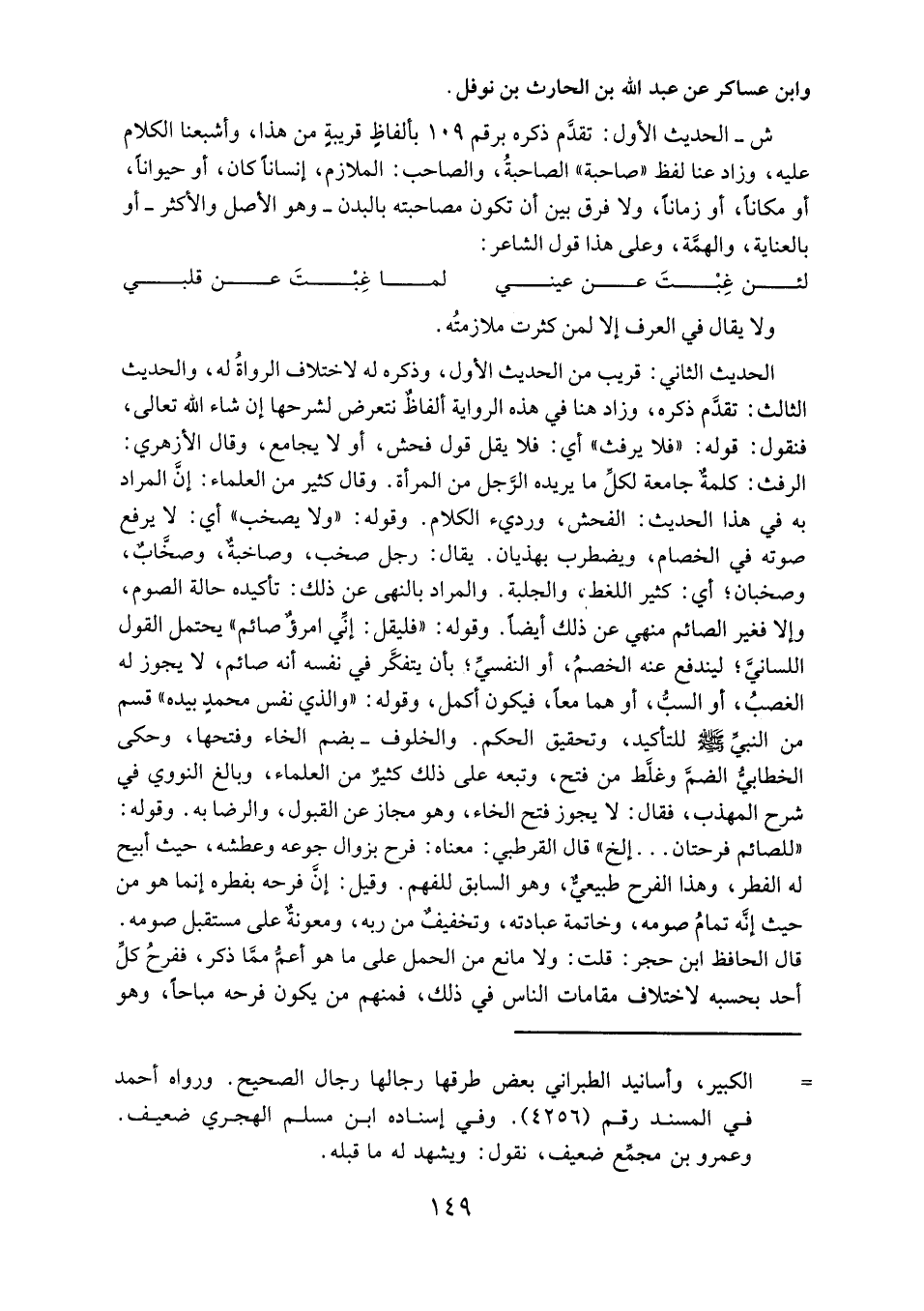 ش- الحديث الأول: تقدم ذكره برقم 109 بألفاظٍ قريبة من هذا، وأشبعنا الكلام عليه، وزاد عنا لفظ "صاحبة" الصاحبة، والصاحب: الملازم، إنسانًا كان، أوحيوانًا، أومكانًا، أوزمانًا، ولا فرق بين أن تكون مصاحبته بالبدن -وهوالأصل والأكثر- أو بالعناية، والهمَّة، وعلى هذا قول الشاعر:
