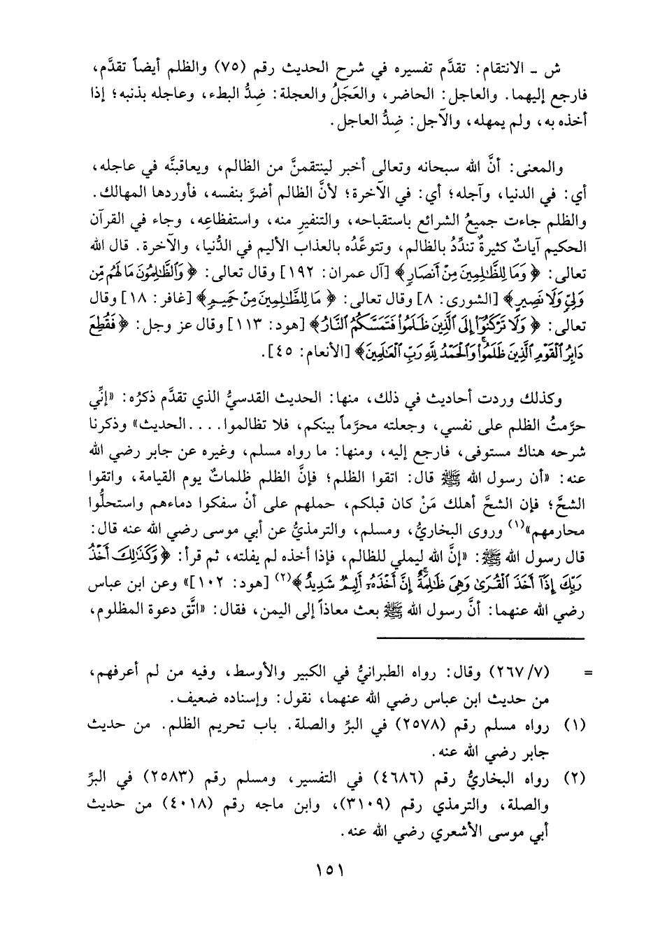 ش- الانتقام: تقدَّم تفسيره في شرح الحديث رقم "75"والظلم أيضًا تقدم، فارجع إليهما. والعاجل: الحاضر، والعَجَل والعجلة: ضد البطء، وعاجله بذنبه؛ إذا أخذه به، ولم يمهله، والآجل: ضد العاجل.