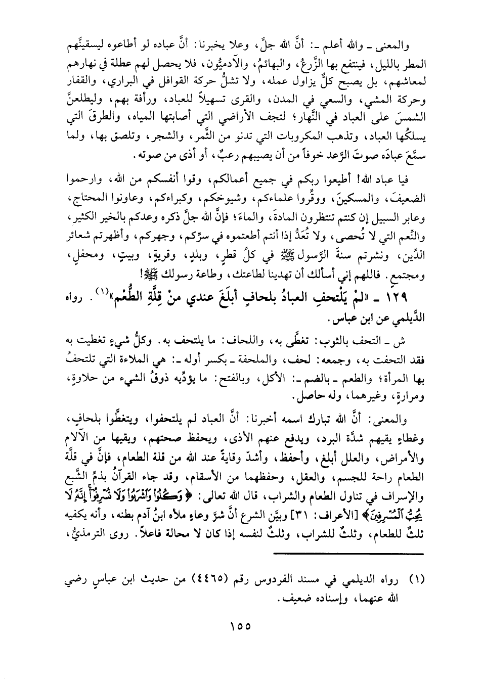 129- "لم يلتحف العباد بلحافٍ أبلغ عندي من قلة الطُّعم"1. رواه الديلمي عن ابن عباس.