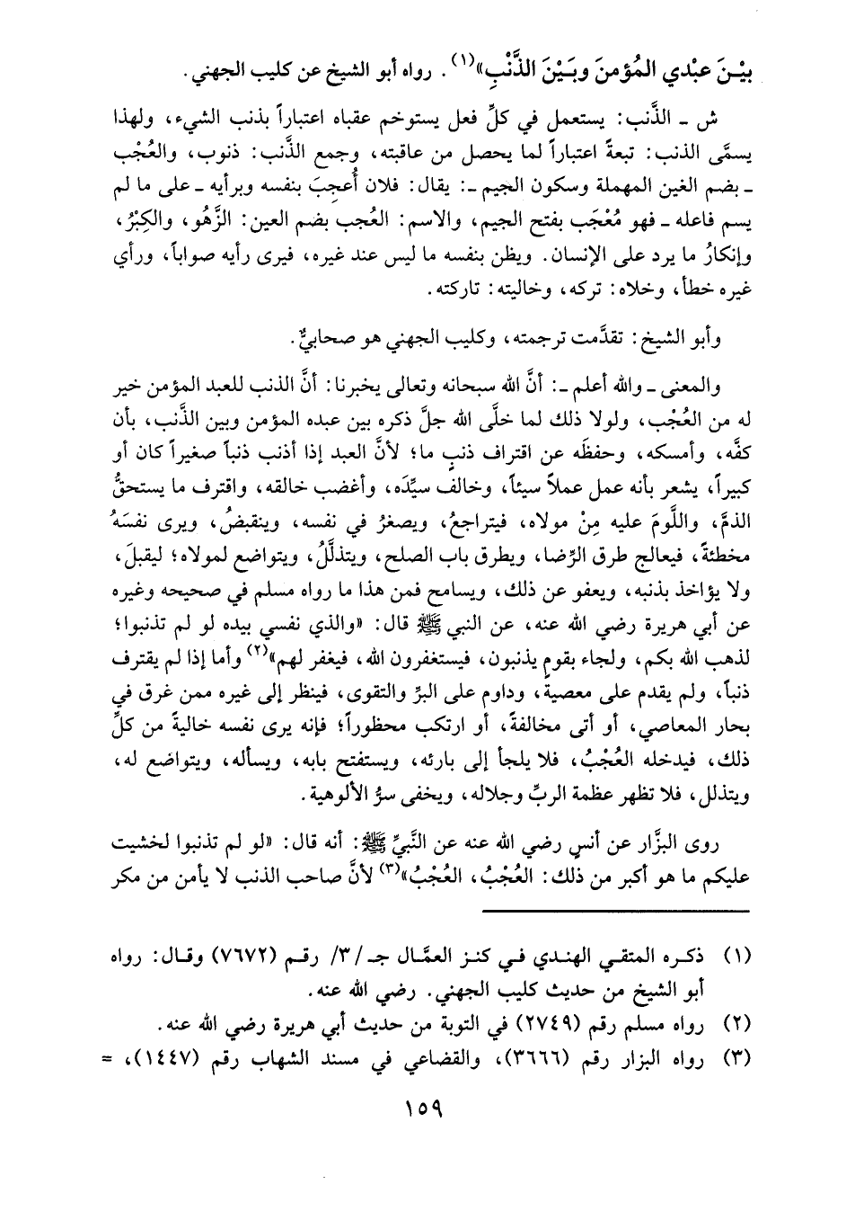 ش- الذنب: يستعمل في كل فعل يستوخم عقباه اعتبارًا بذنب الشيء، ولهذا يسمى الذنب: تبعةاعتبارًا لما يحصل من عاقبته، وجمع الذنب: ذنوب، والعجب -بضم الغين المهملة وسكون الجيم-: يُقال: فلان أعجب بنفسه وبرأيه -على ما لم يسم فاعله- فهو معجب بفتح الجيم، والاسم: العجب بضم العين: الزهو، والكبر، وإنكار ما يرد على الإنسان. ويظن بنفسه ما ليس عند غيره، فيرى رأيه صوابًا، ورأي غيره خطأ، وخلاه: تركه، وخاليته: تاركته.