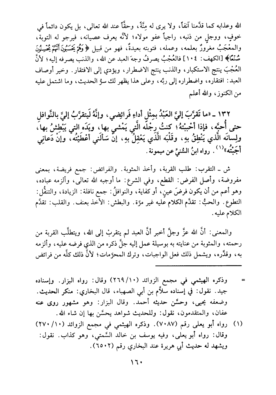 132- "ما تقرب إلي العبد بمثل أداء فرائضي، وإنه ليتقرب إلي بالنوافل حتى أحبه، فإذا أحببته؛ كنت رجله التي يمشي بها، ويده التي يبطش بها، ولسانه الذي ينطق به، وقلبه الذي يعقل به، إن سألني أعطيته، وإن دعاني أجبته" 1. رواه ابن السني عن ميمونة.