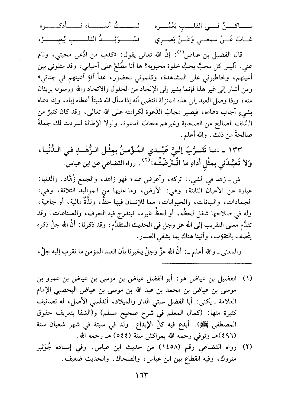 133- "ما تقرب إلي عبدي المؤمن بمثل الزهد في الدنيا، ولا تعبدني بمثل أداء ما افترضته"1. رواه القضاعي عن ابن عباس.
