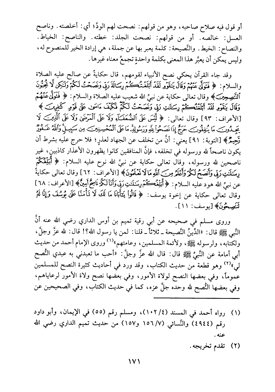 وروى مسلم في صحيحه عن أبي رقية تميم بن أوس الداري رضي الله عنه أن النبي صلى الله عليه وسلم قال: "الدين النصيحة -ثلاثًا- قلنا: لمن يا رسول الله؟! قال: لله عز وجل، ولكتابه، ولرسوله صلى الله عليه وسلم، ولأئمة المسلمين، وعامتهم" 1 وروى الإمام أحمد من حديث أبي أمامة عن النبي صلى الله عليه وسلم قال: قال الله عز وجل: "أحب ما تعبدني به عبدي النصح لي" 2 وهو قطعة من حديث الكتاب، وقد ورد في أحاديث كثيرة النصح للمسلمين عموماً، وفي بعضها النصح لولاة الأمور، وفي بعضها نصح ولاة الأمور لرعايهم، وفي بعضها النصح لله وحده جلَّ عزه، كما في حديث الكتاب، وفي الصحيحين عن